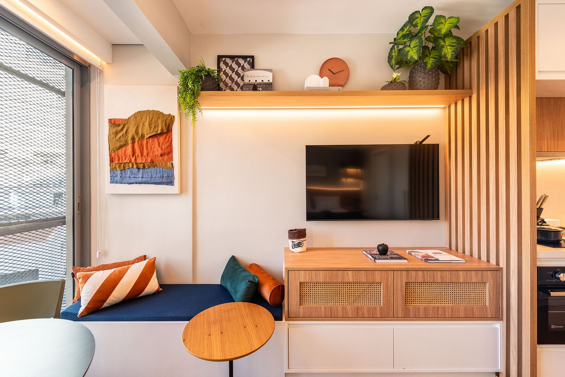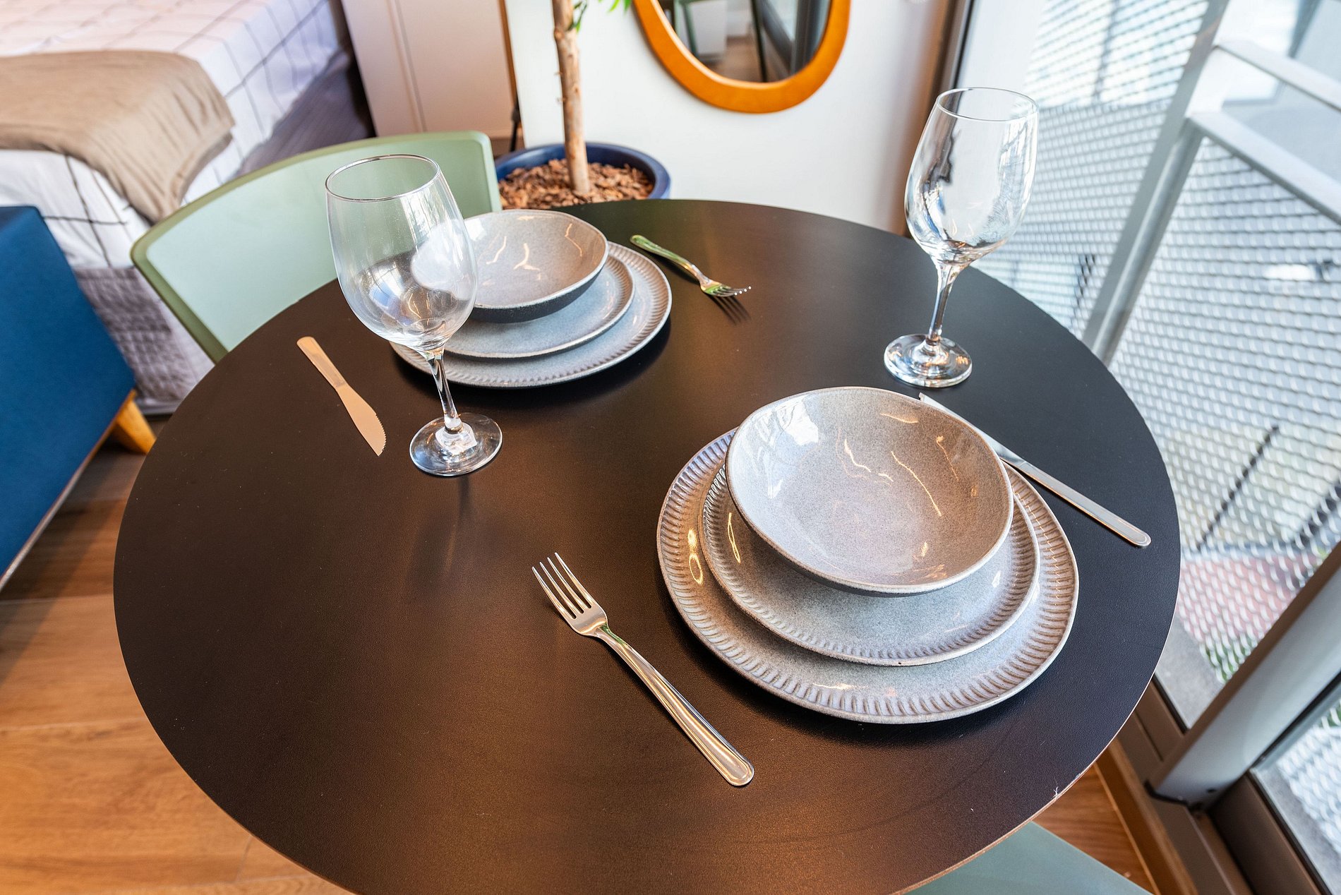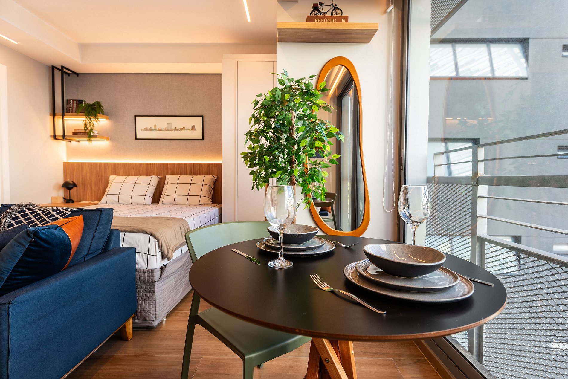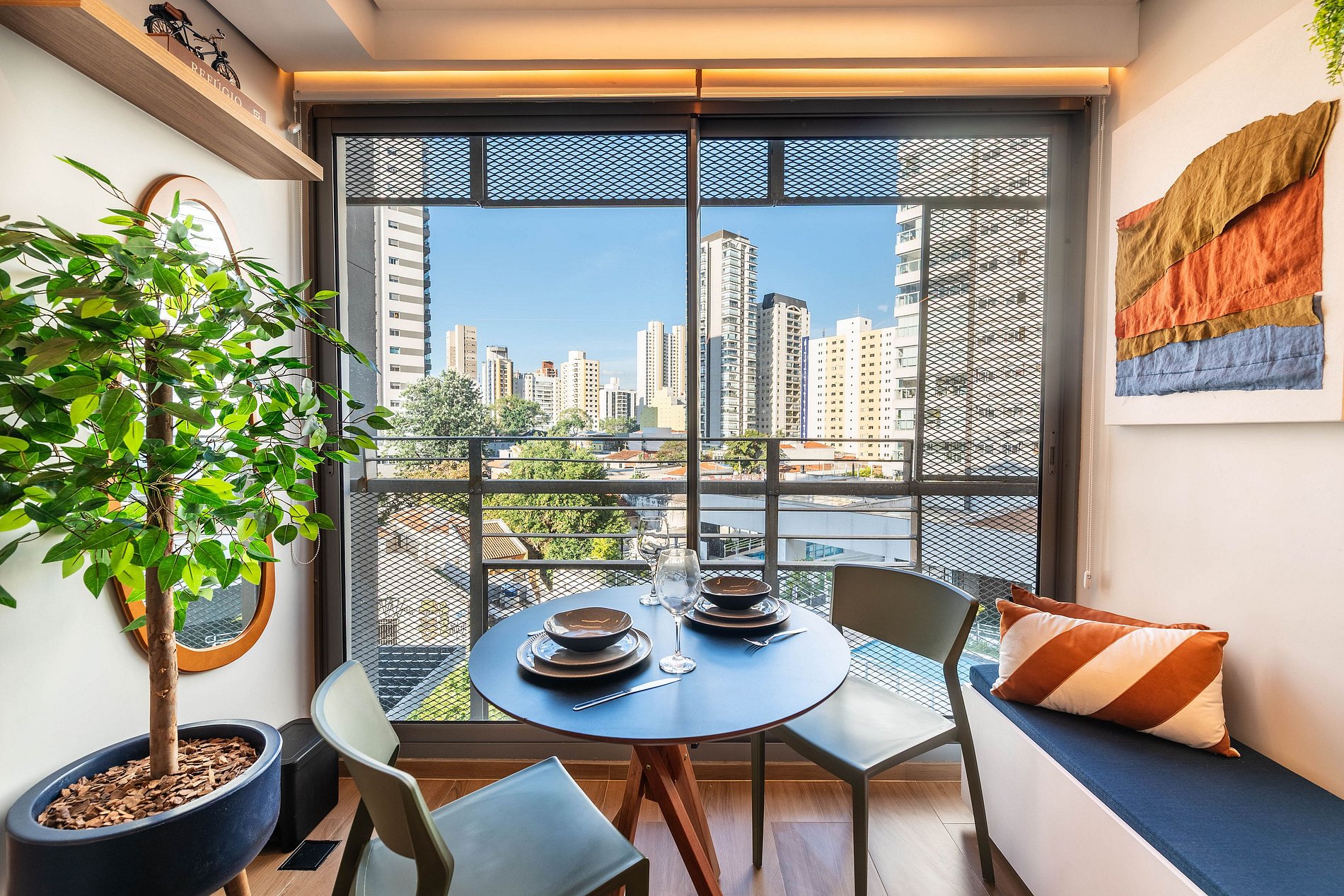A varanda é iluminada e acolhedora, com mesa de jantar para dois, vista urbana e banco com almofadas coloridas. Há também uma escrivaninha com cadeira ergonômica, ideal para quem precisa trabalhar remotamente com conforto e produtividade.