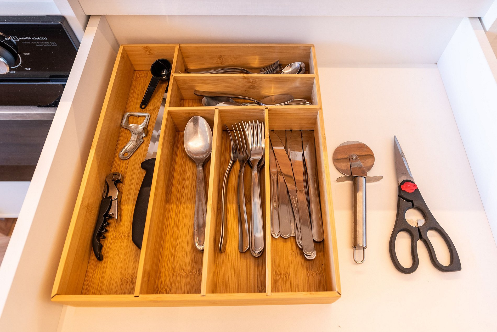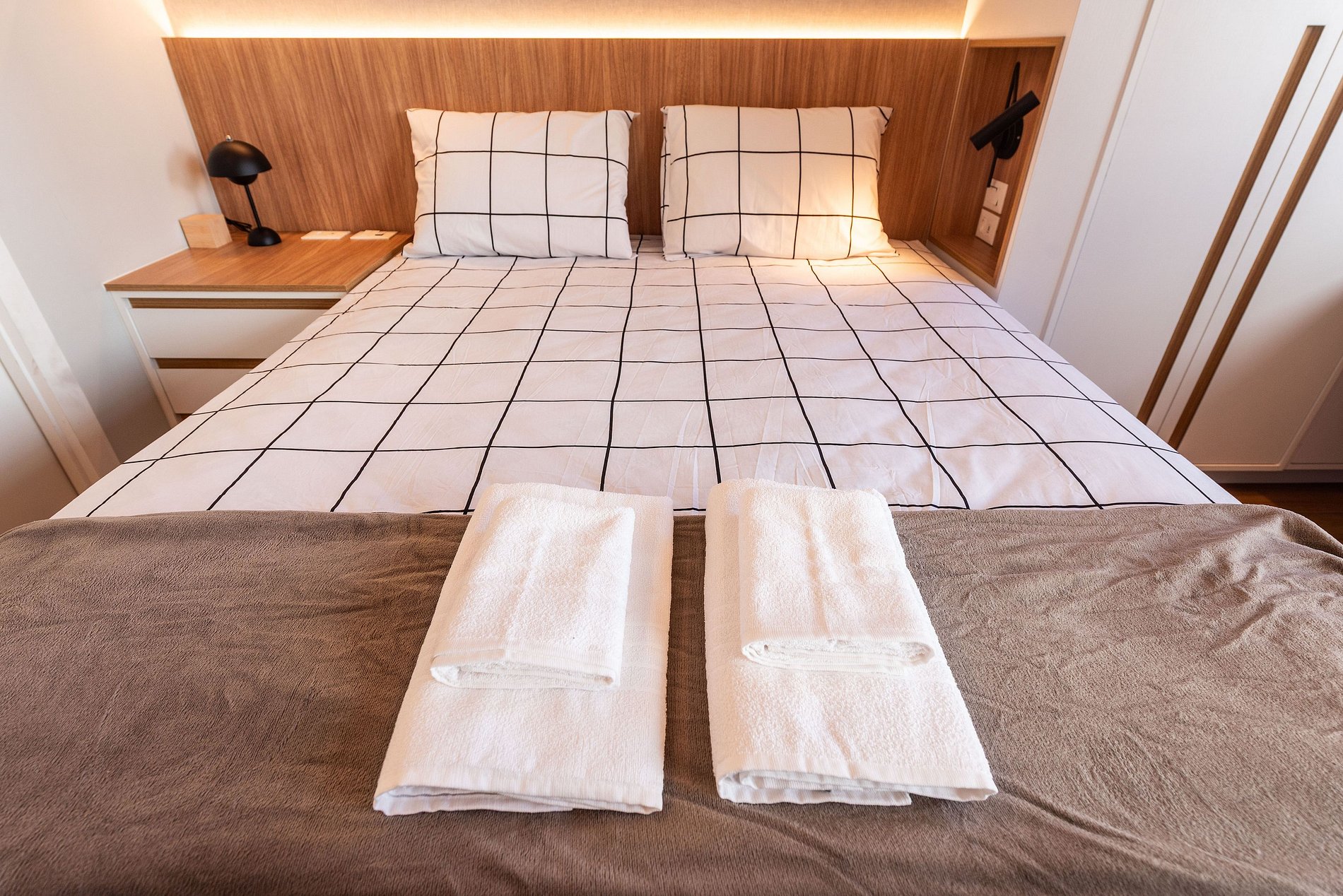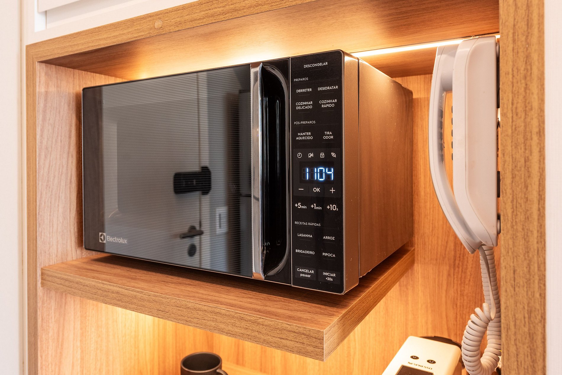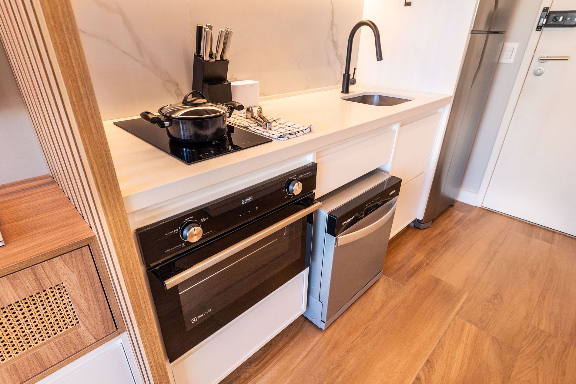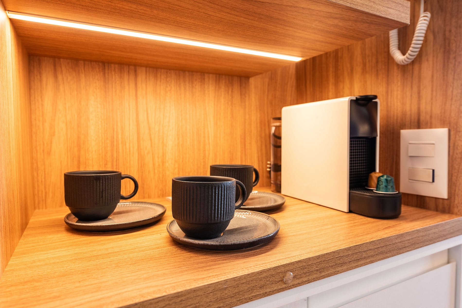A cozinha é equipada com forno, cooktop, micro-ondas, geladeira duplex, lava-louças, liquidificador, torradeira e duas cafeteiras (elétrica e Nespresso), além de utensílios completos. O banheiro é elegante e funcional, com chuveiro espaçoso, toalheiro aquecido, secador e amenities de qualidade.
