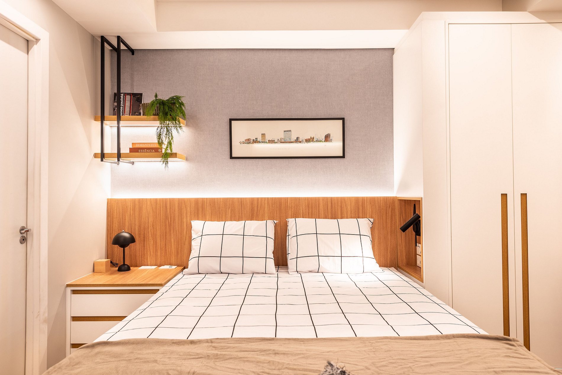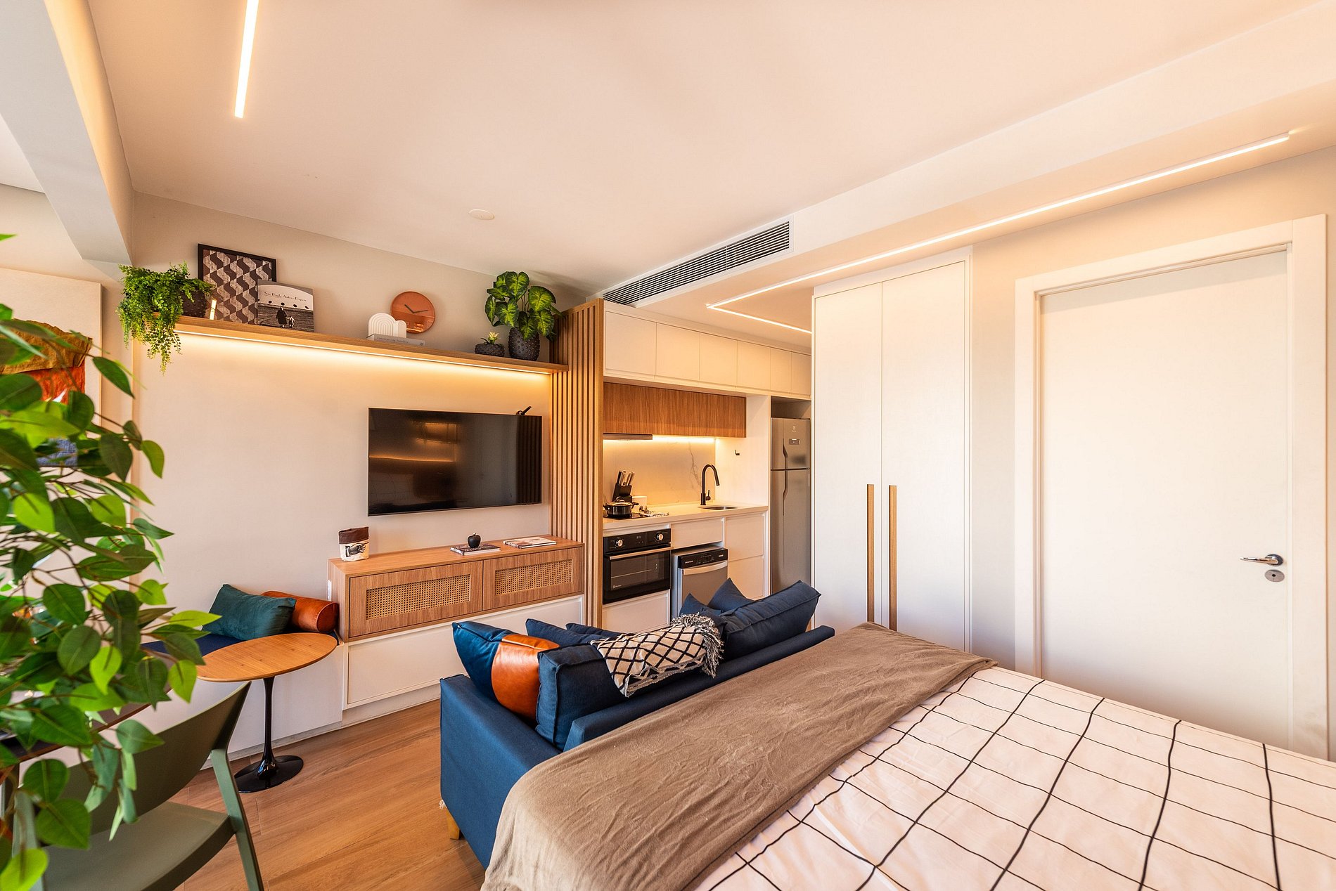 Este studio foi cuidadosamente projetado para unir estética e funcionalidade. Com atmosfera acolhedora e decoração de estilo boho-contemporâneo, o ambiente integra cama queen com roupa de cama premium, sofá confortável, Smart TV, blackout e ar-condicionado central.