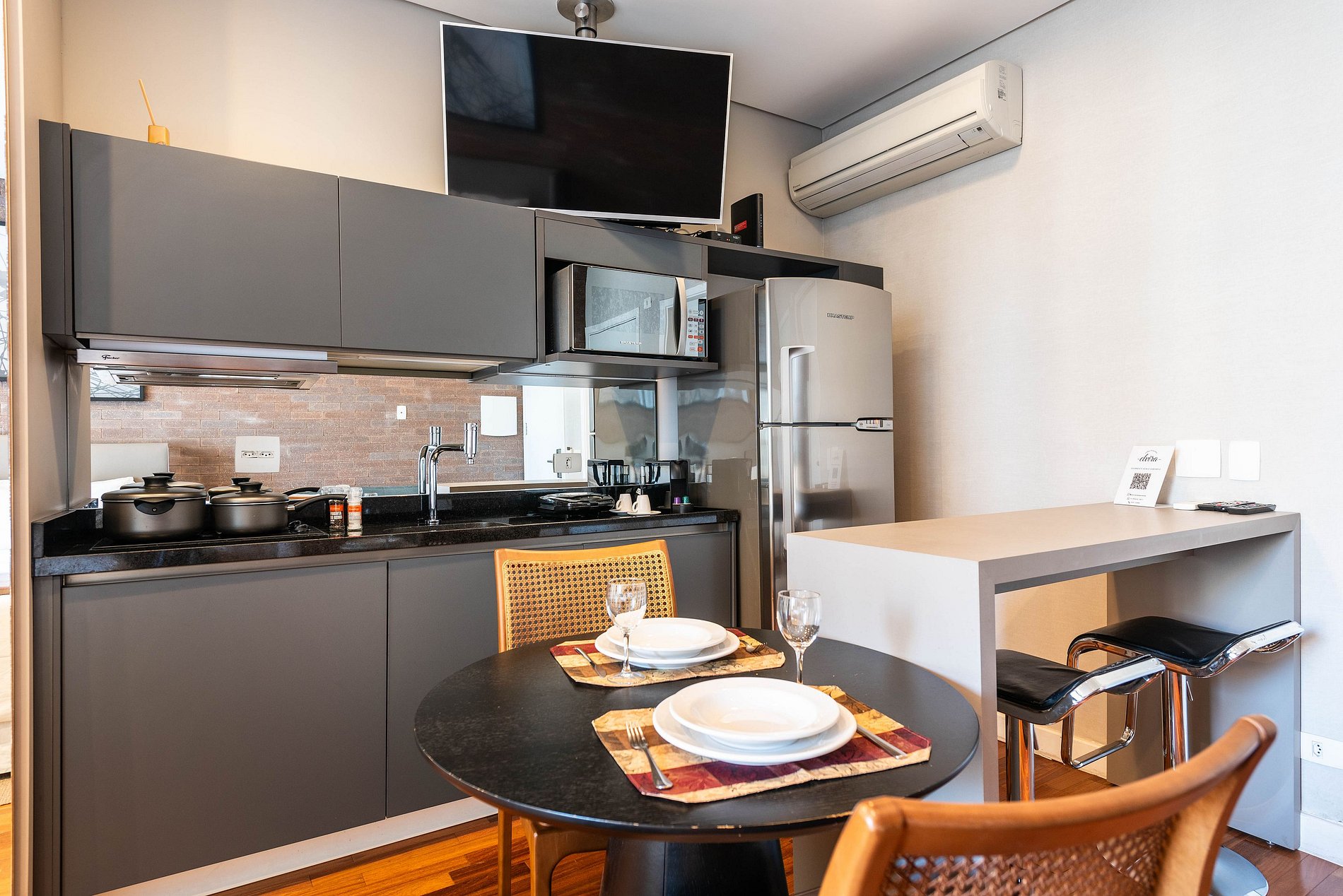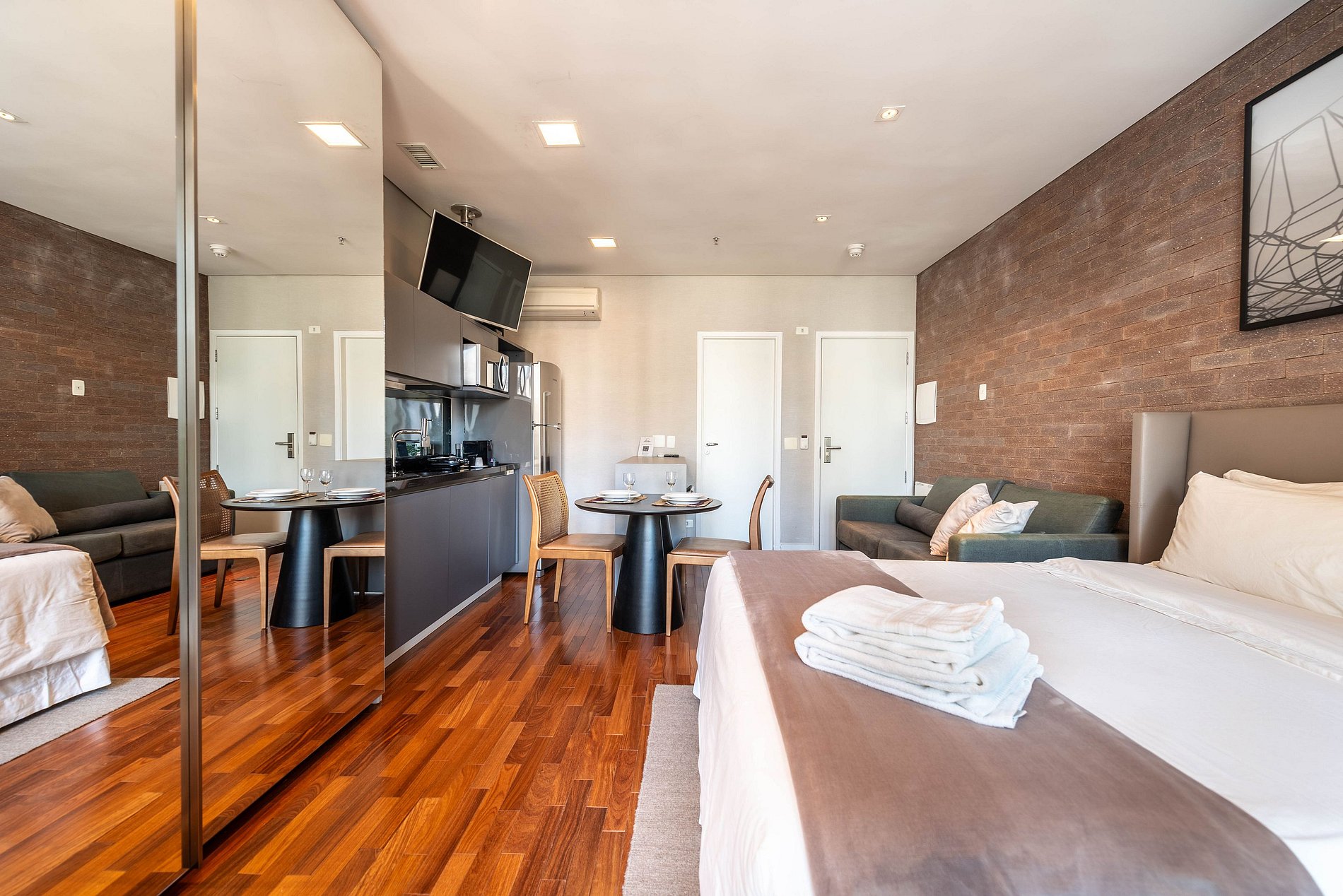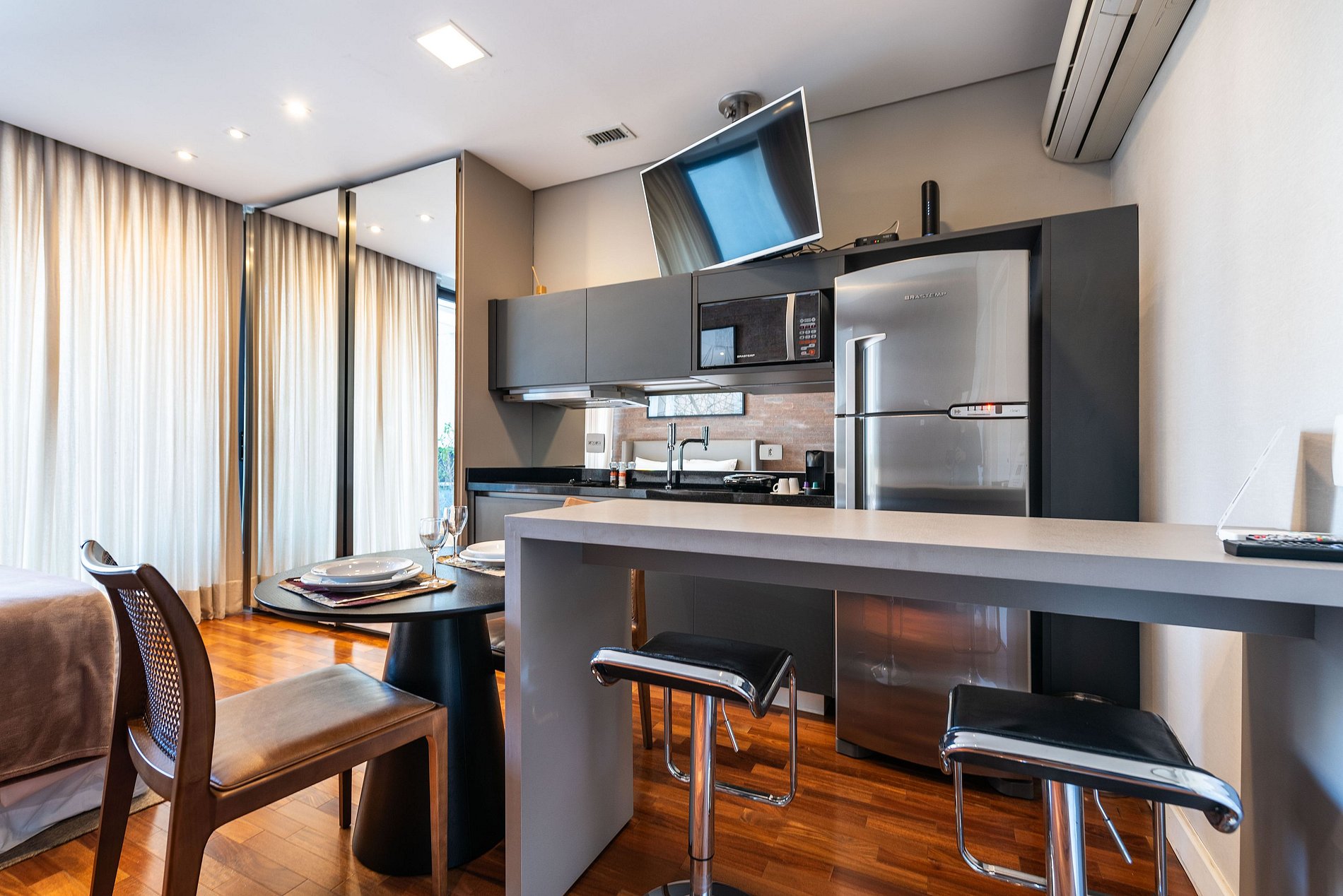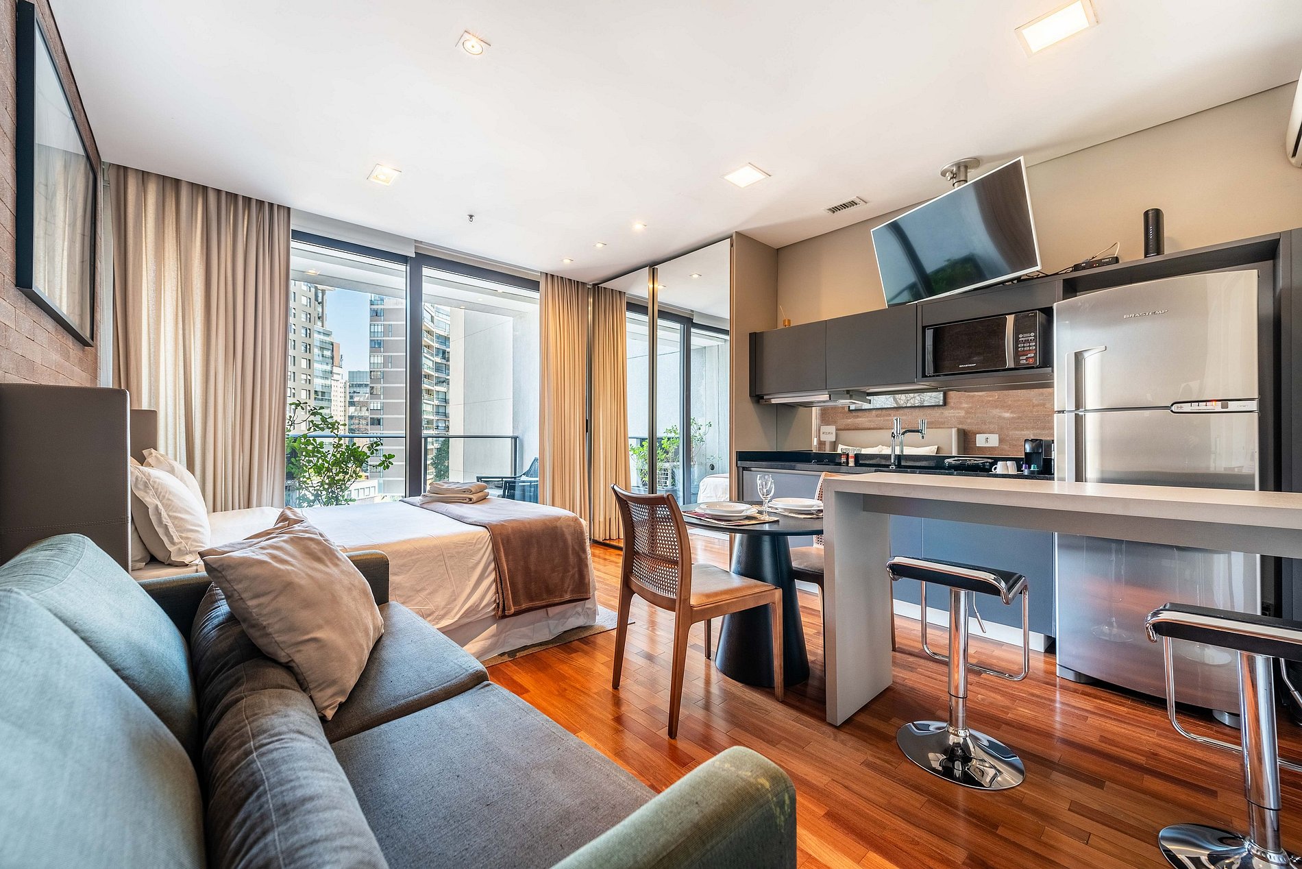 Este studio foi projetado para unir conforto, praticidade e sofisticação. Conta com cama queen size, enxoval de alto padrão, sofá aconchegante, mesa para refeições ou home office, Smart TV e ar-condicionado. A cozinha compacta está totalmente equipada com micro-ondas, cooktop, frigobar, cafeteira e utensílios completos. A varanda privativa garante uma vista incrível para os prédios da Vila Olímpia, trazendo luz natural e charme ao ambiente. O banheiro moderno oferece chuveiro a gás, secador de cabelo e amenidades de qualidade.