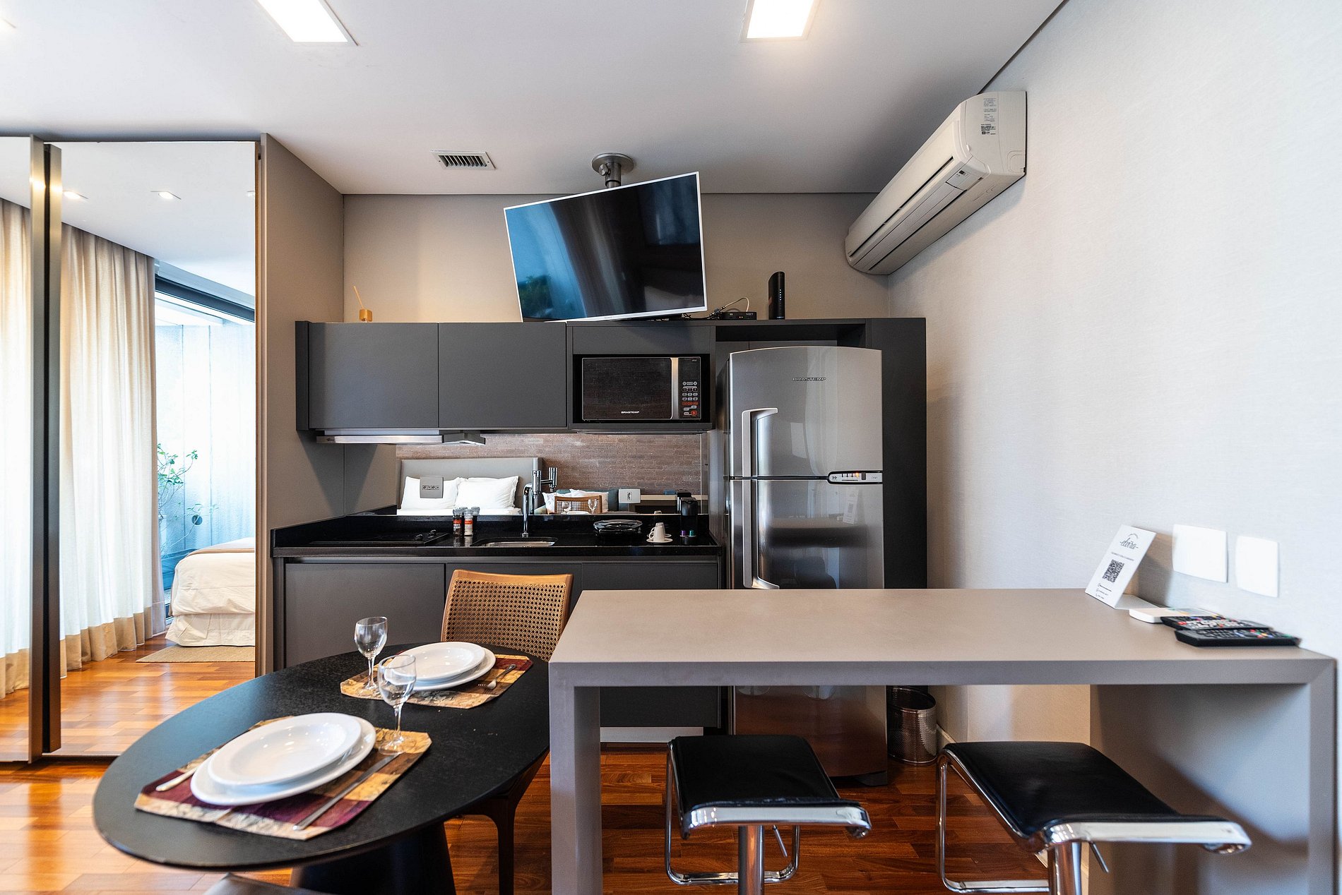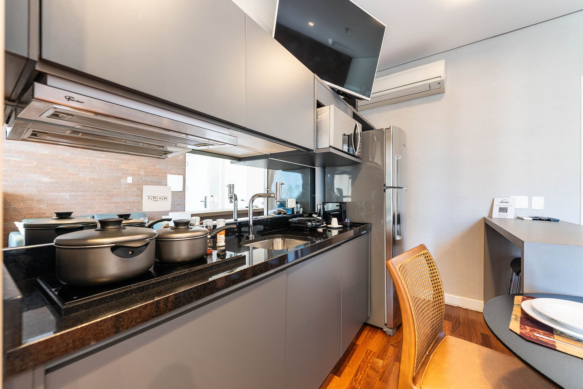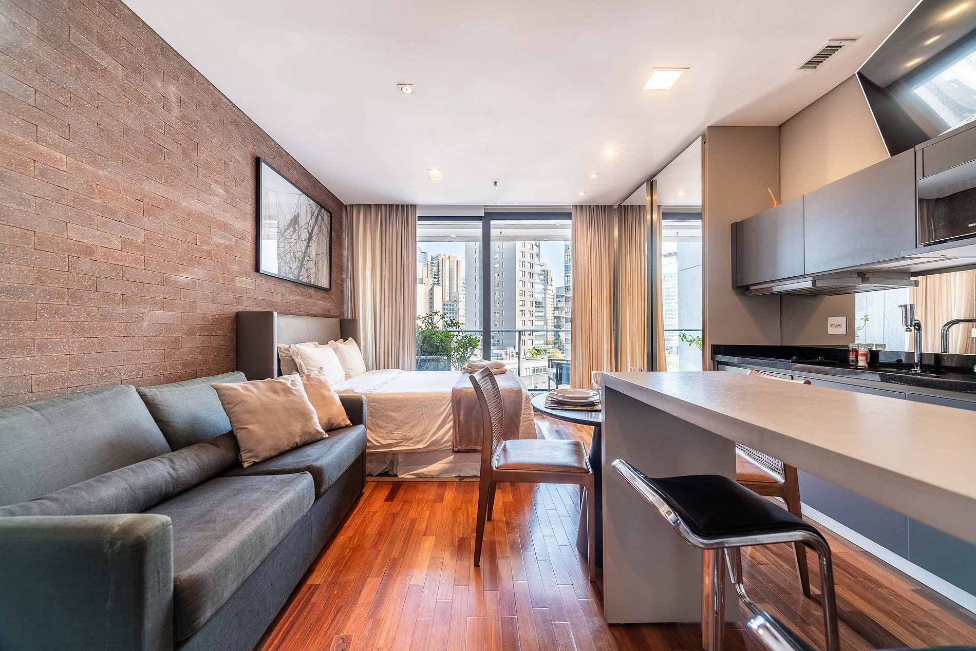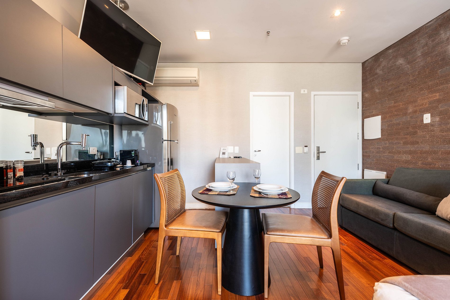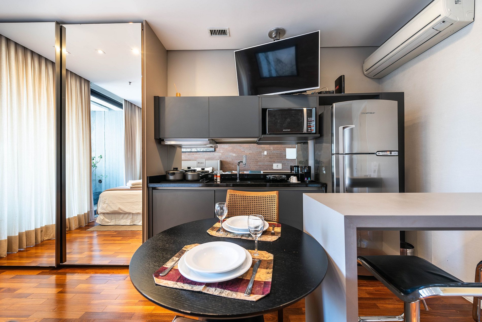 Este studio foi projetado para unir conforto, praticidade e sofisticação. Conta com cama queen size, enxoval de alto padrão, sofá aconchegante, mesa para refeições ou home office, Smart TV e ar-condicionado. A cozinha compacta está totalmente equipada com micro-ondas, cooktop, frigobar, cafeteira e utensílios completos. A varanda privativa garante uma vista incrível para os prédios da Vila Olímpia, trazendo luz natural e charme ao ambiente. O banheiro moderno oferece chuveiro a gás, secador de cabelo e amenidades de qualidade.