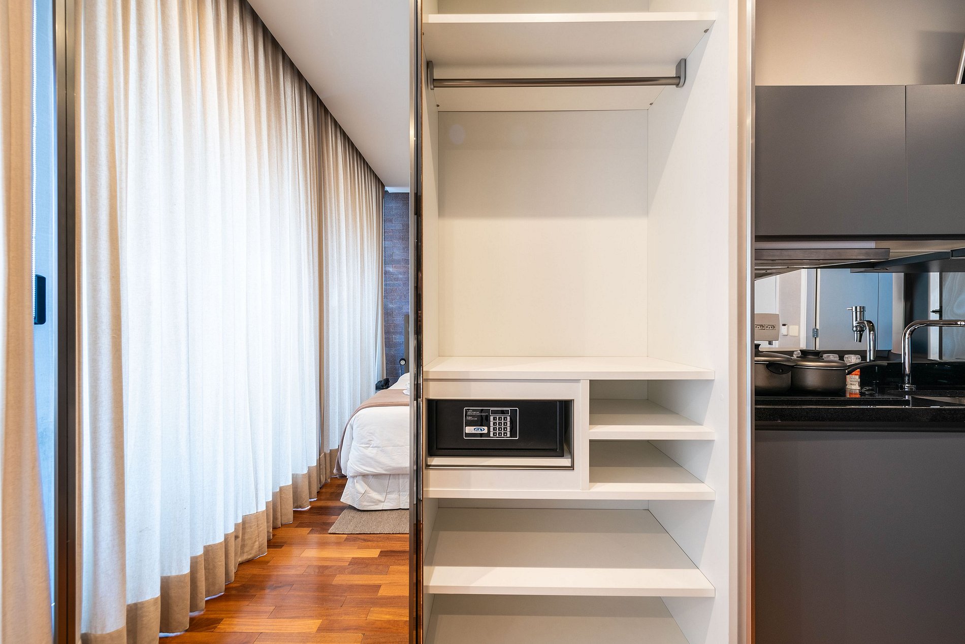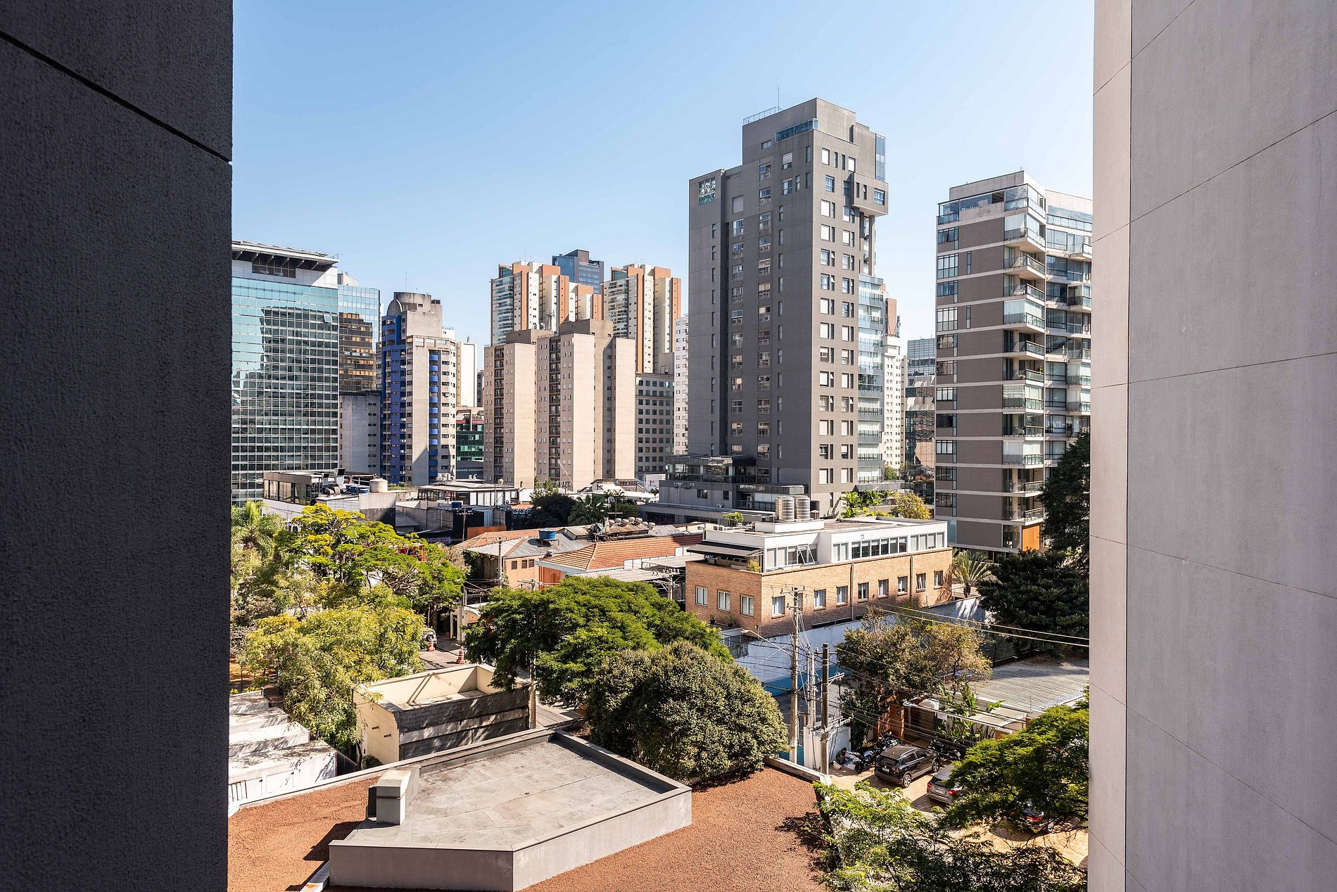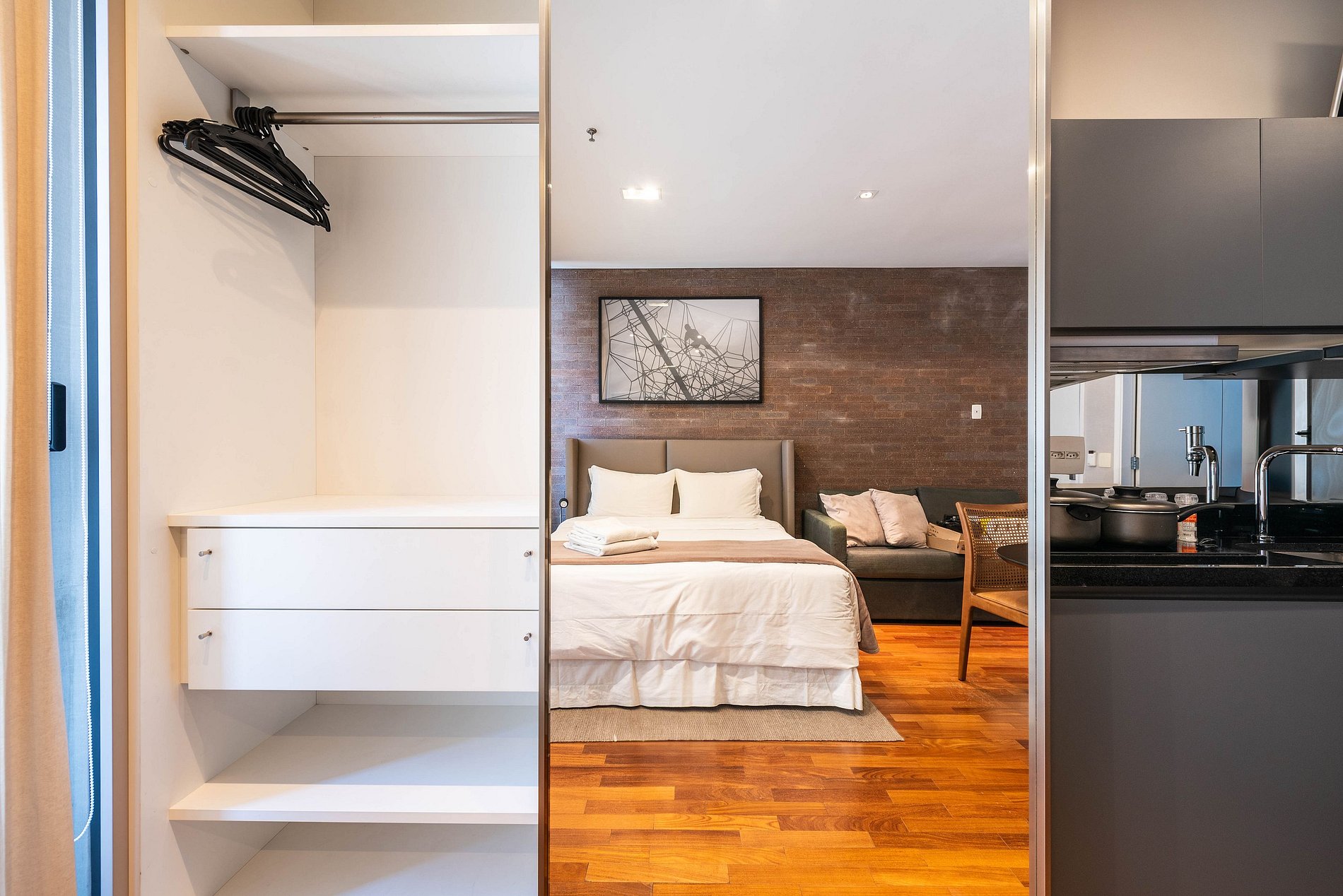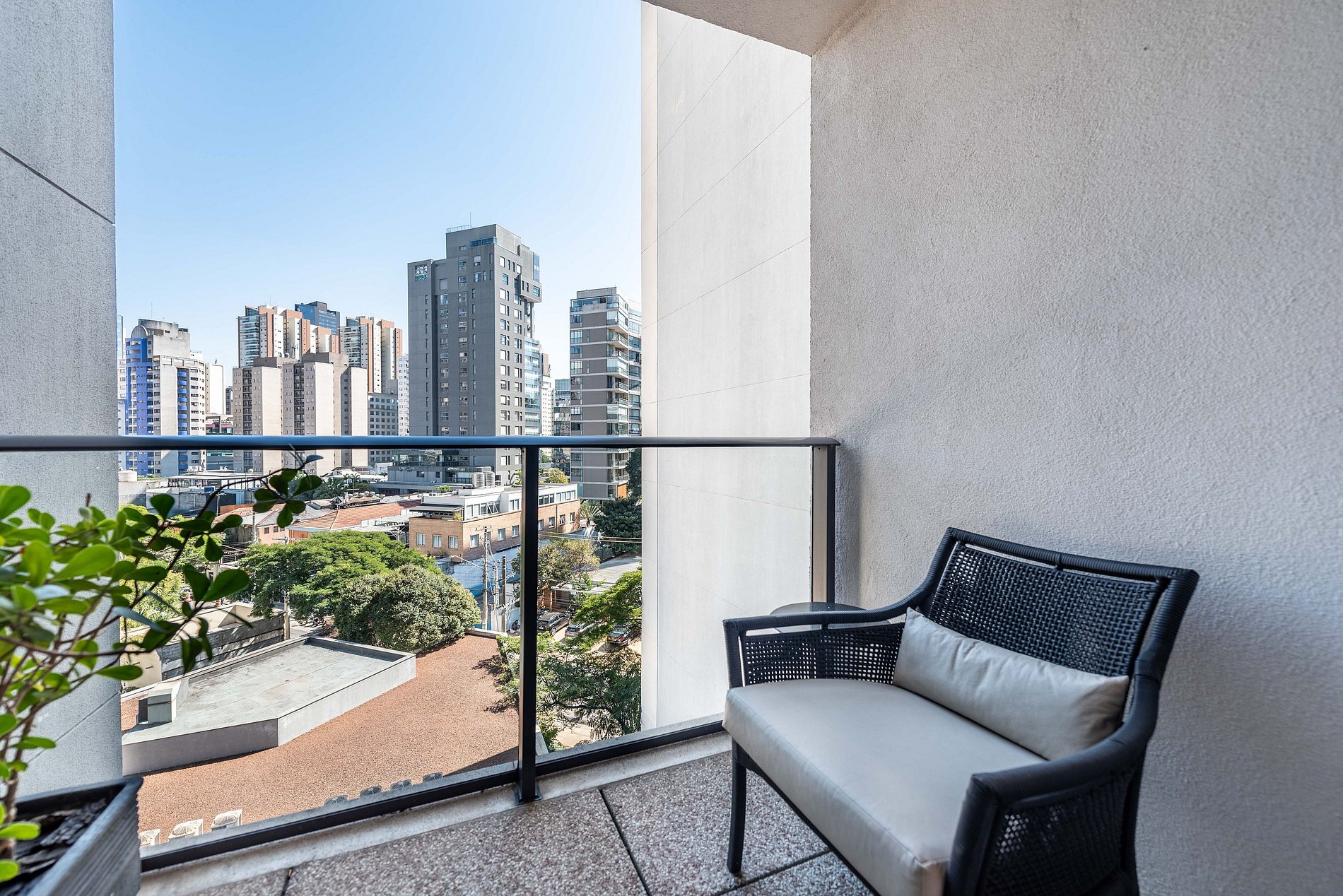 Este studio foi projetado para unir conforto, praticidade e sofisticação. Conta com cama queen size, enxoval de alto padrão, sofá aconchegante, mesa para refeições ou home office, Smart TV e ar-condicionado. A cozinha compacta está totalmente equipada com micro-ondas, cooktop, frigobar, cafeteira e utensílios completos. A varanda privativa garante uma vista incrível para os prédios da Vila Olímpia, trazendo luz natural e charme ao ambiente. O banheiro moderno oferece chuveiro a gás, secador de cabelo e amenidades de qualidade.