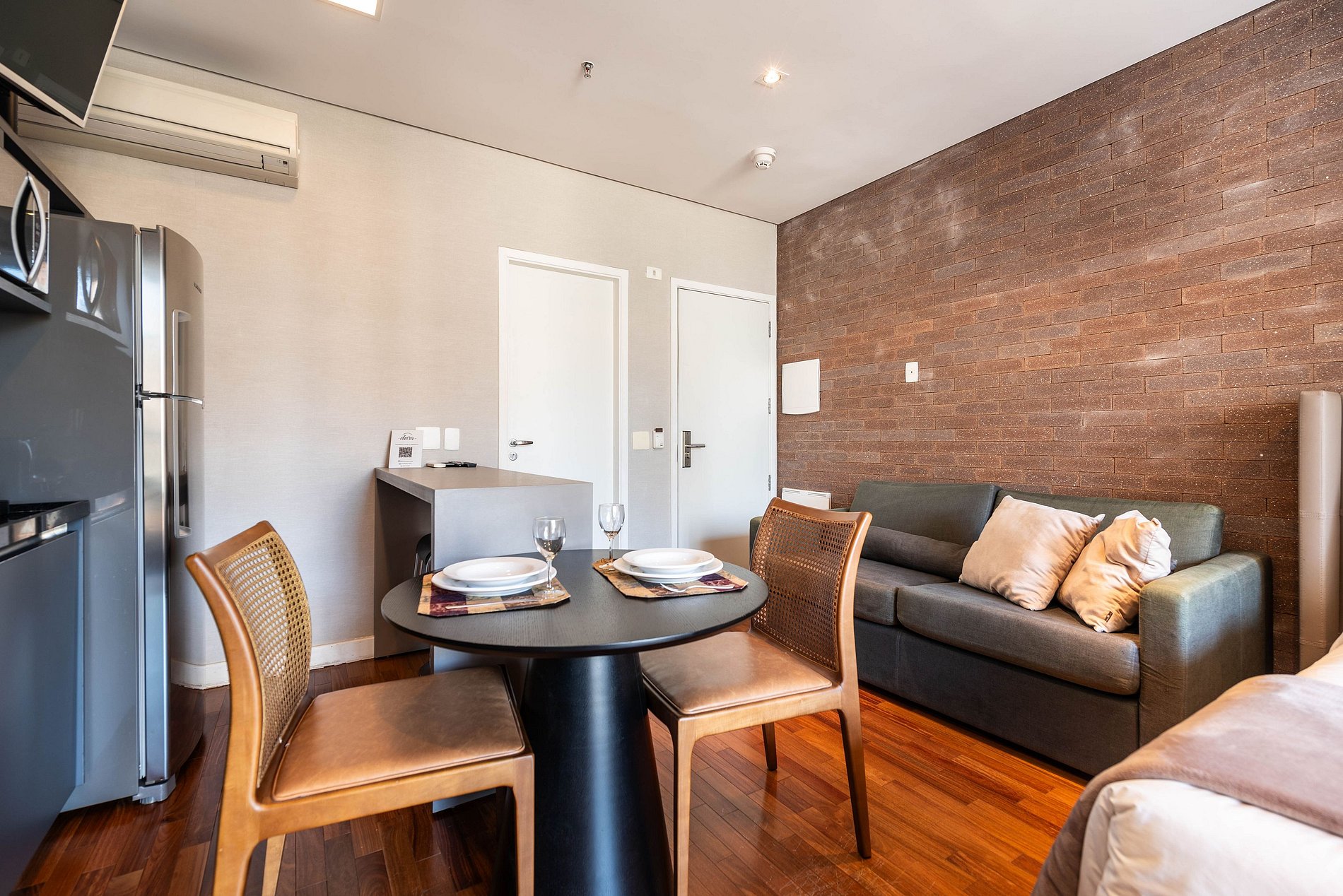 Este studio foi projetado para unir conforto, praticidade e sofisticação. Conta com cama queen size, enxoval de alto padrão, sofá aconchegante, mesa para refeições ou home office, Smart TV e ar-condicionado. A cozinha compacta está totalmente equipada com micro-ondas, cooktop, frigobar, cafeteira e utensílios completos. A varanda privativa garante uma vista incrível para os prédios da Vila Olímpia, trazendo luz natural e charme ao ambiente. O banheiro moderno oferece chuveiro a gás, secador de cabelo e amenidades de qualidade.