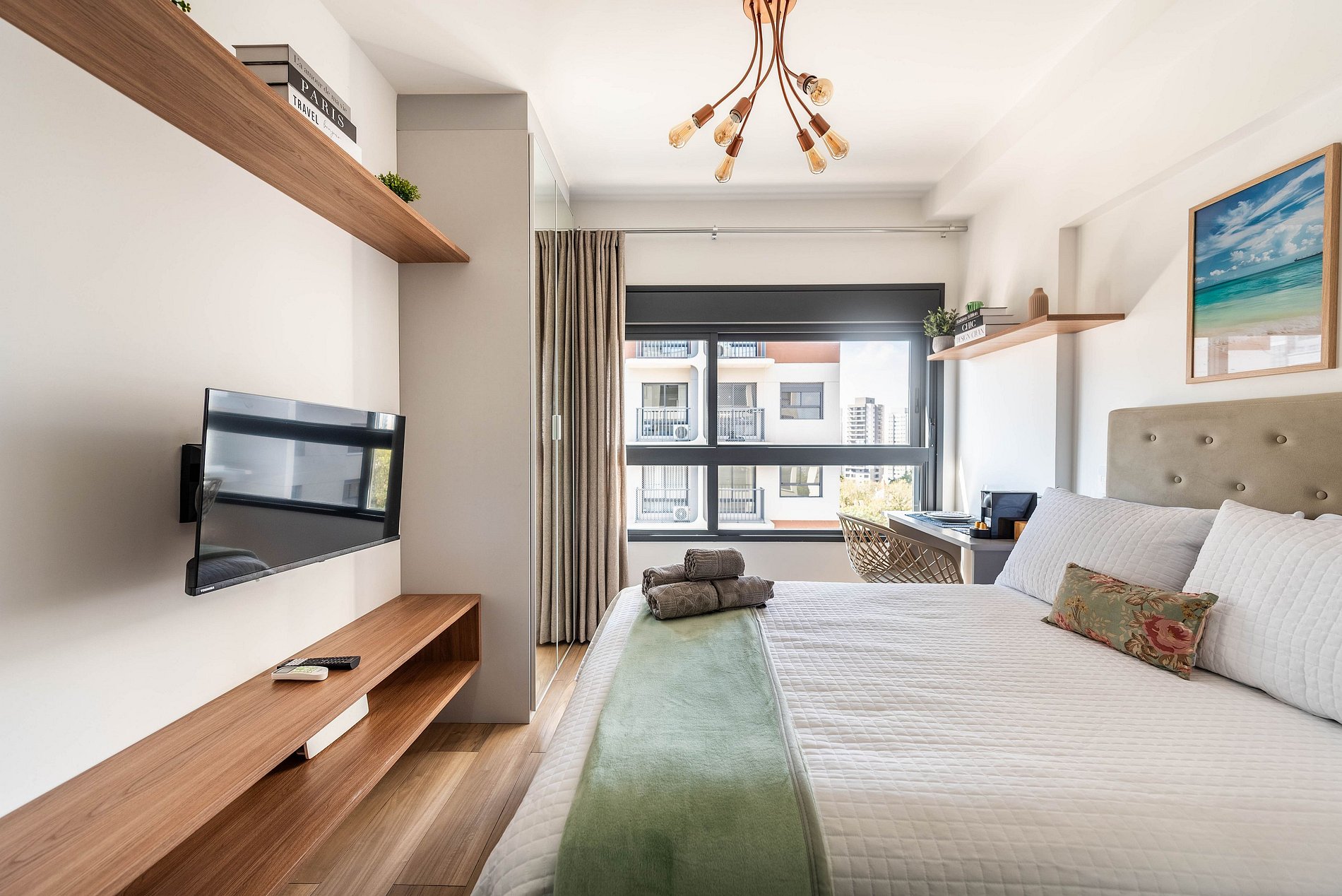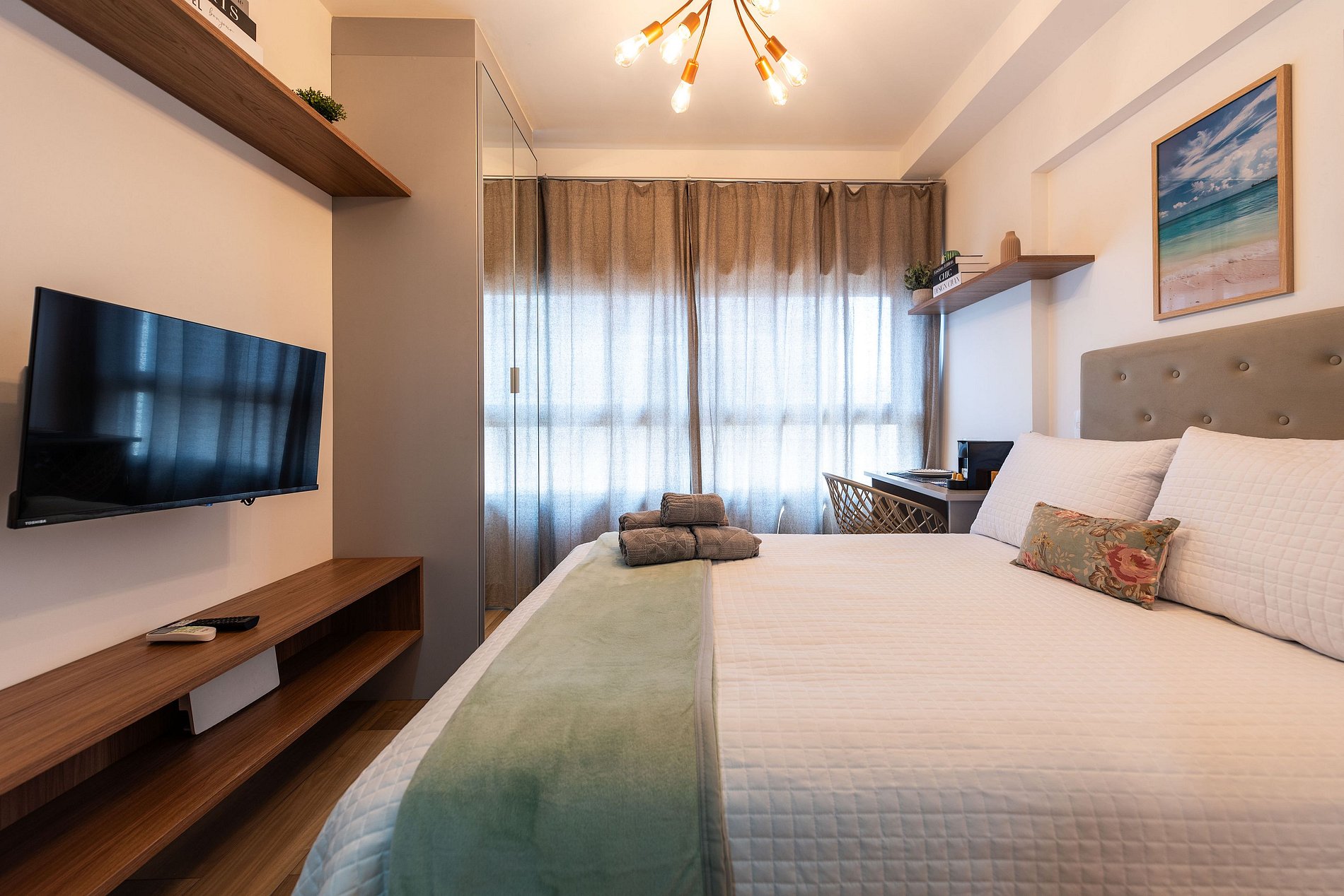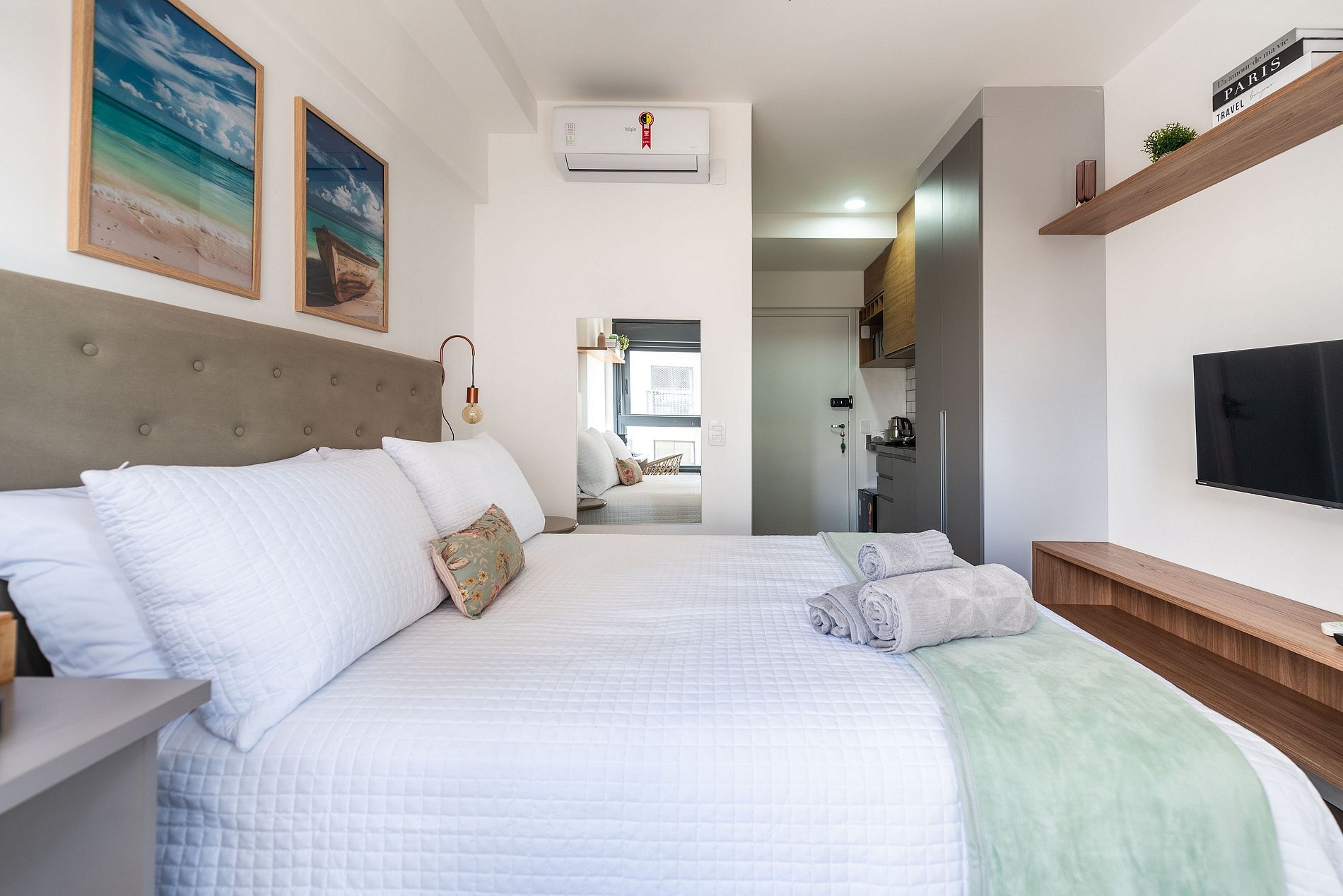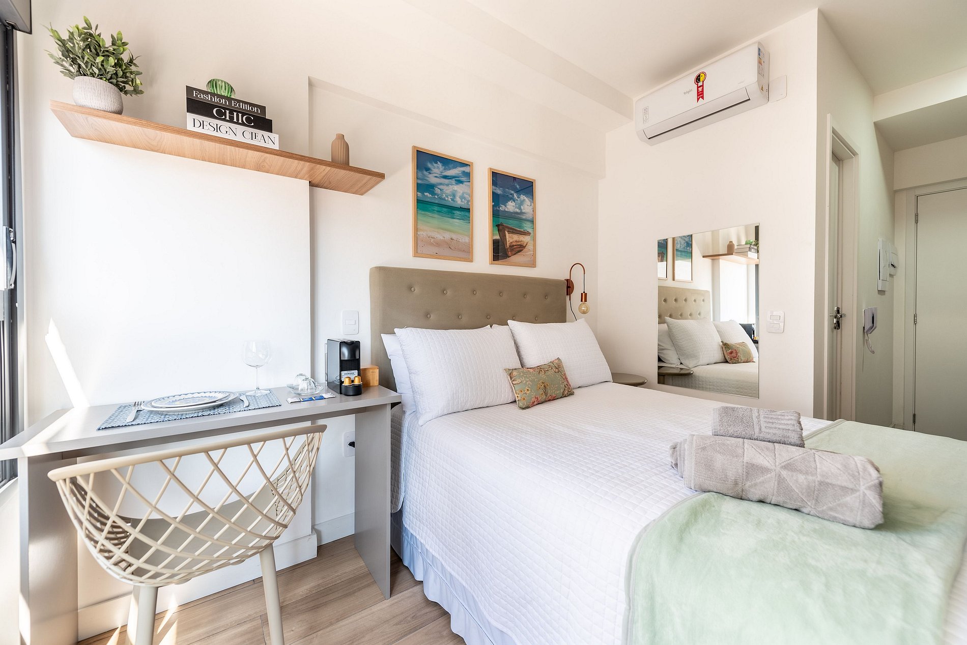 Este studio foi cuidadosamente decorado para unir estilo e praticidade. A paleta neutra e os acabamentos de alto padrão proporcionam um ambiente moderno e acolhedor. A cama de casal com enxoval de hotel garante noites relaxantes. A cozinha é compacta, mas completa, com utensílios, cooktop, chaleira elétrica, micro-ondas e frigobar. Para momentos de descanso, há uma, smart TV e uma charmosa bancada para refeições ou trabalho.