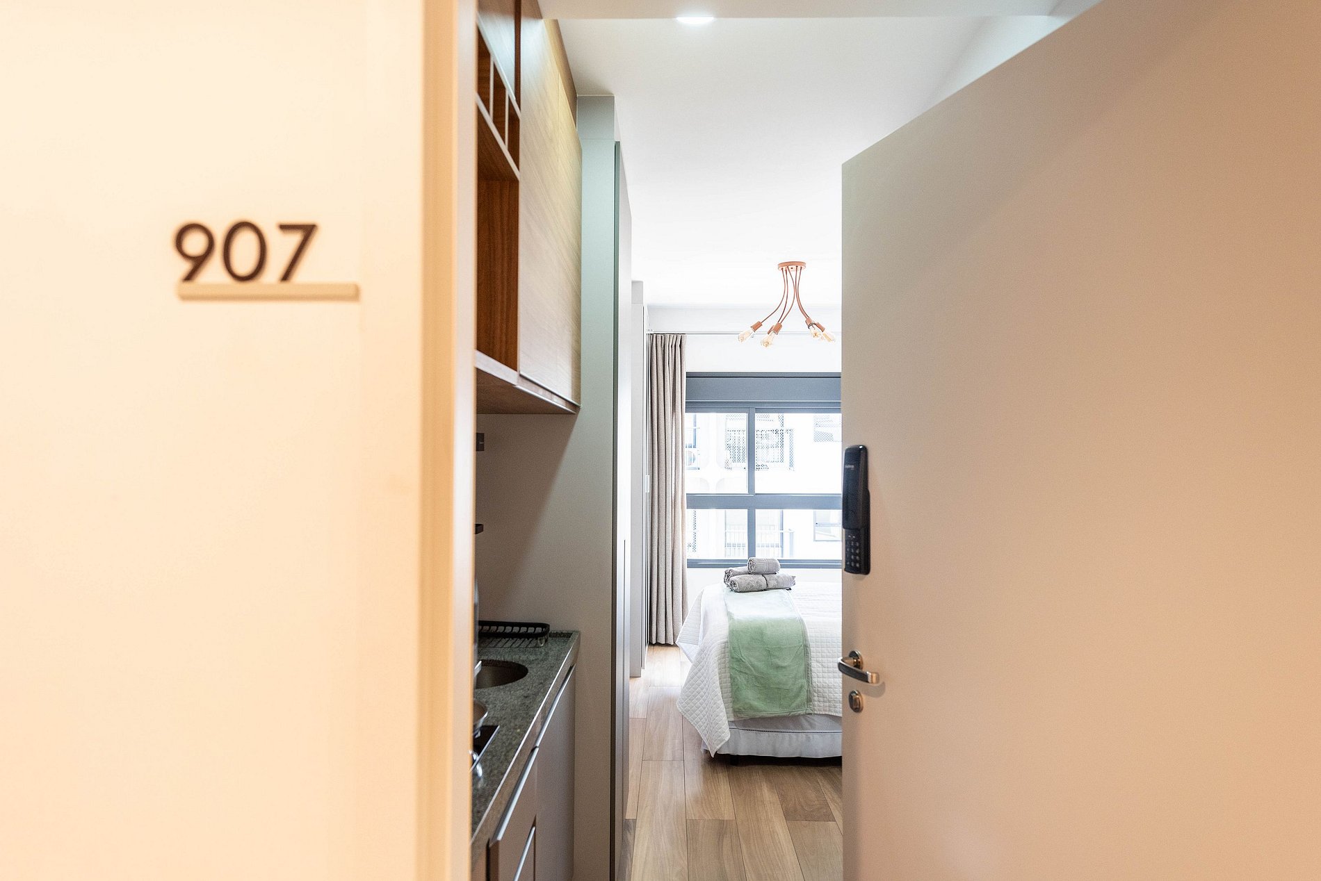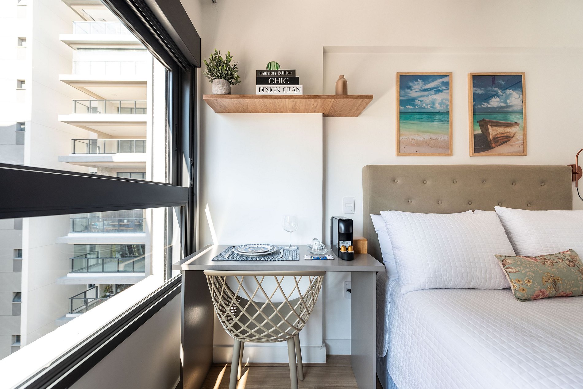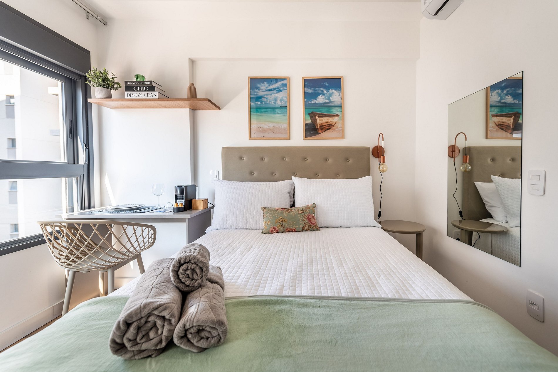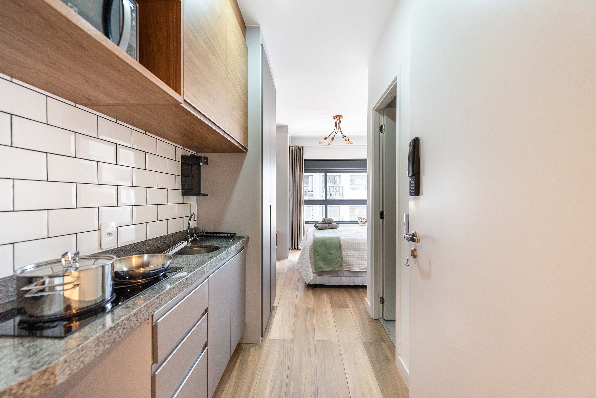 Este studio foi cuidadosamente decorado para unir estilo e praticidade. A paleta neutra e os acabamentos de alto padrão proporcionam um ambiente moderno e acolhedor. A cama de casal com enxoval de hotel garante noites relaxantes. A cozinha é compacta, mas completa, com utensílios, cooktop, chaleira elétrica, micro-ondas e frigobar. Para momentos de descanso, há uma, smart TV e uma charmosa bancada para refeições ou trabalho.