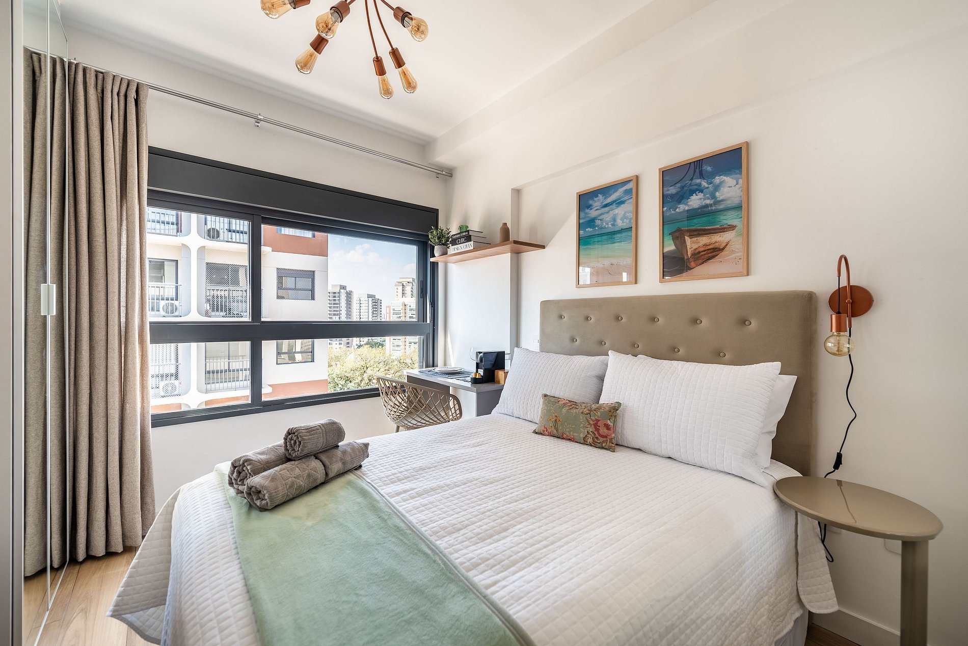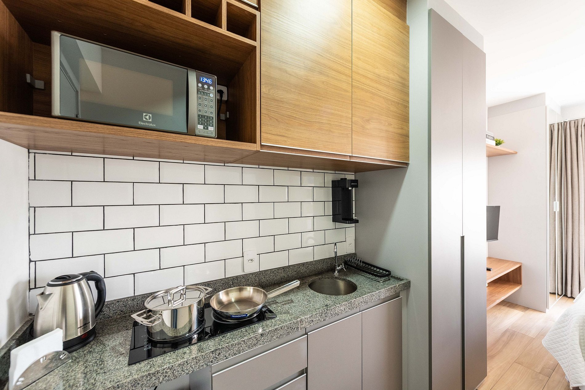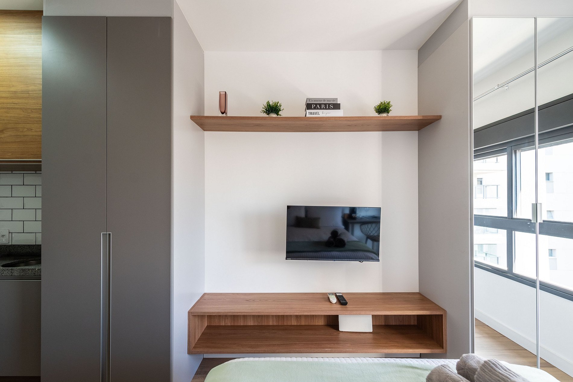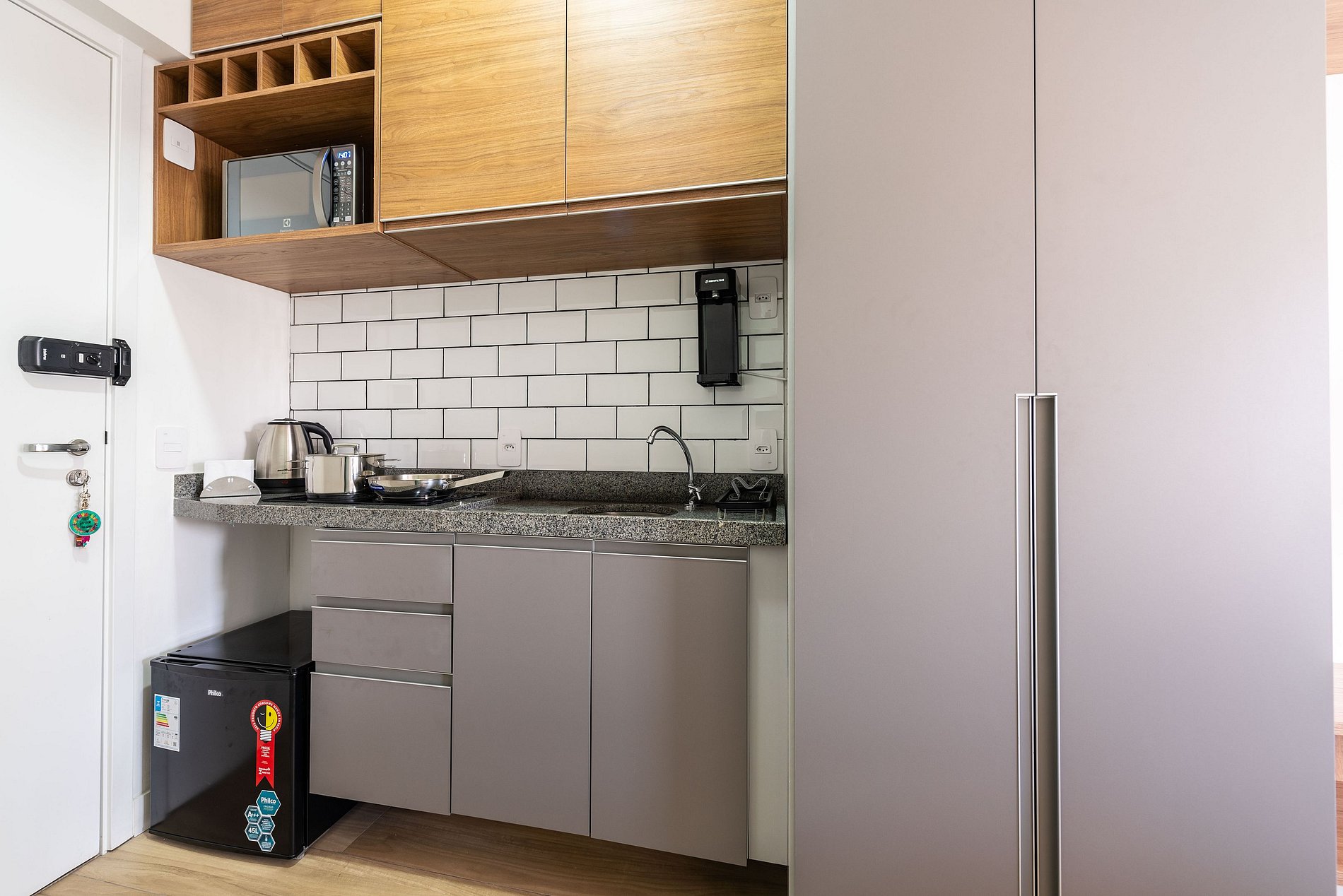 Este studio foi cuidadosamente decorado para unir estilo e praticidade. A paleta neutra e os acabamentos de alto padrão proporcionam um ambiente moderno e acolhedor. A cama de casal com enxoval de hotel garante noites relaxantes. A cozinha é compacta, mas completa, com utensílios, cooktop, chaleira elétrica, micro-ondas e frigobar. Para momentos de descanso, há uma, smart TV e uma charmosa bancada para refeições ou trabalho.