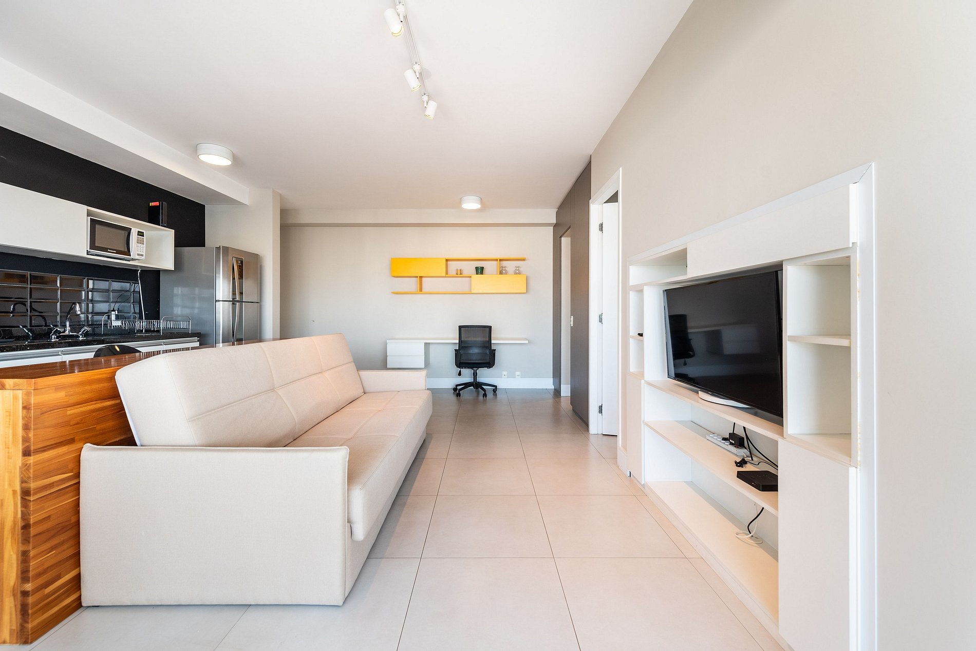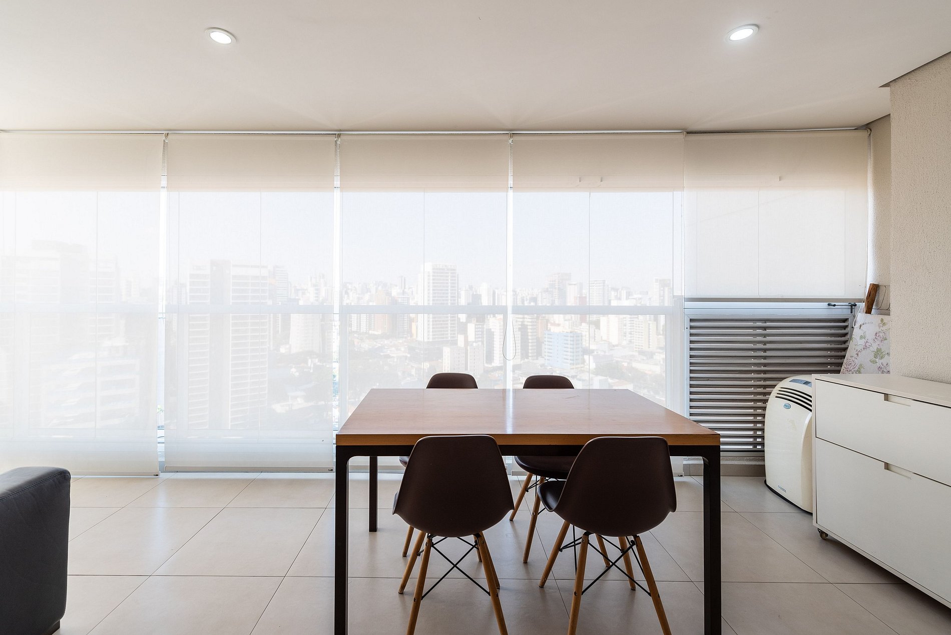 Localizado no 24º andar, o apartamento tem uma vista deslumbrante da vibrante Avenida Faria Lima e do icônico prédio Tomie Ohtake. A varanda ampla conta com mesa de jantar e sofá confortável, ideal para relaxar. Sala de estar com Smart TV e espaço dedicado para home office. Cozinha americana moderna e totalmente equipada: cooktop, forno, micro‑ondas, lava e seca, geladeira duplex, cafeteira Nespresso, sanduicheira e filtro de água gelada. O quarto tem cama de casal com cortinas blackout, TV também virada para o quarto, muito espaço no armário e enxovais premium. Sofá‑cama acomoda até 2 hóspedes adicionais. Ar‑condicionado em todo o imóvel e banheiro com chuveiro potente e aquecimento a gás, secador e toalhas de excelente qualidade.