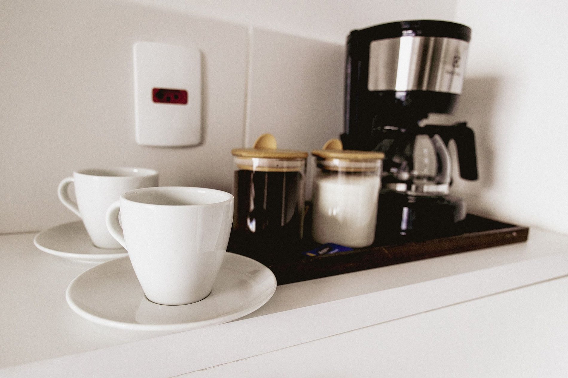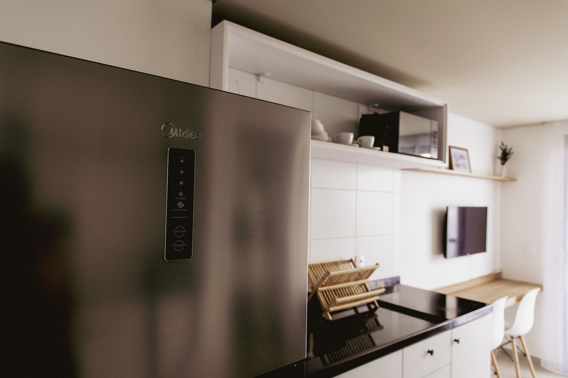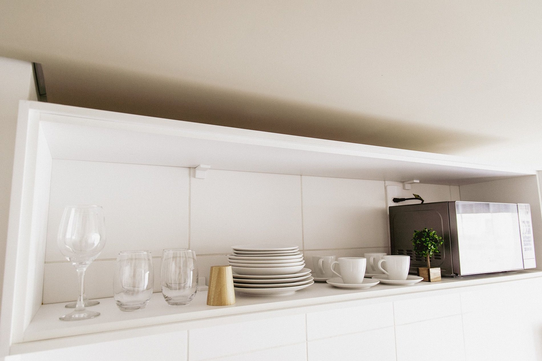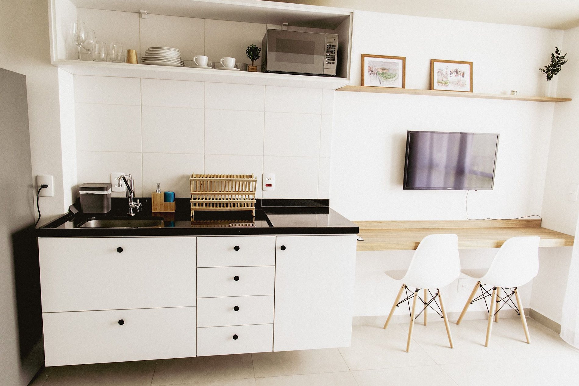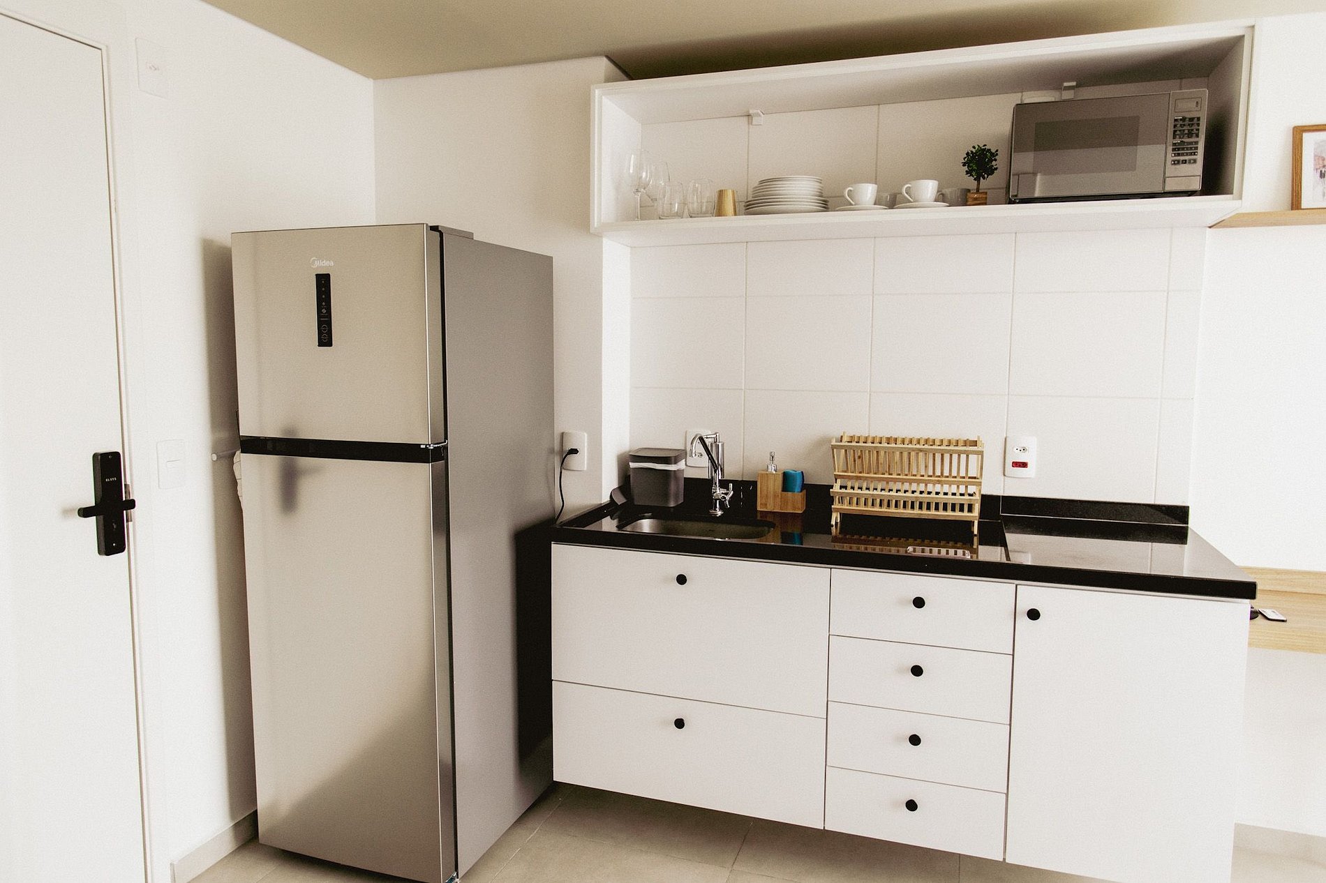 - Cozinha compacta com utensílios, cafeteira, liquidificador e micro-ondas