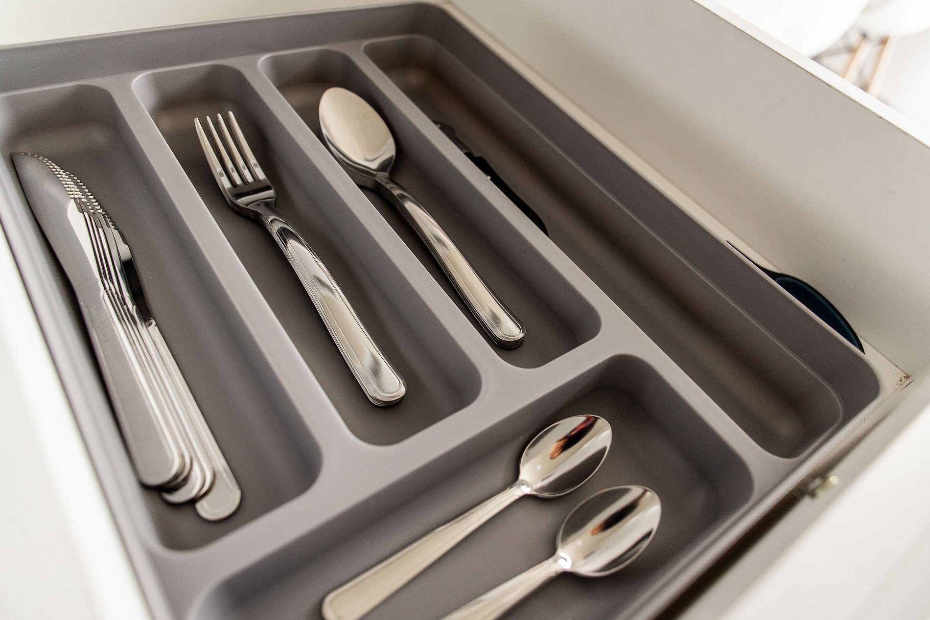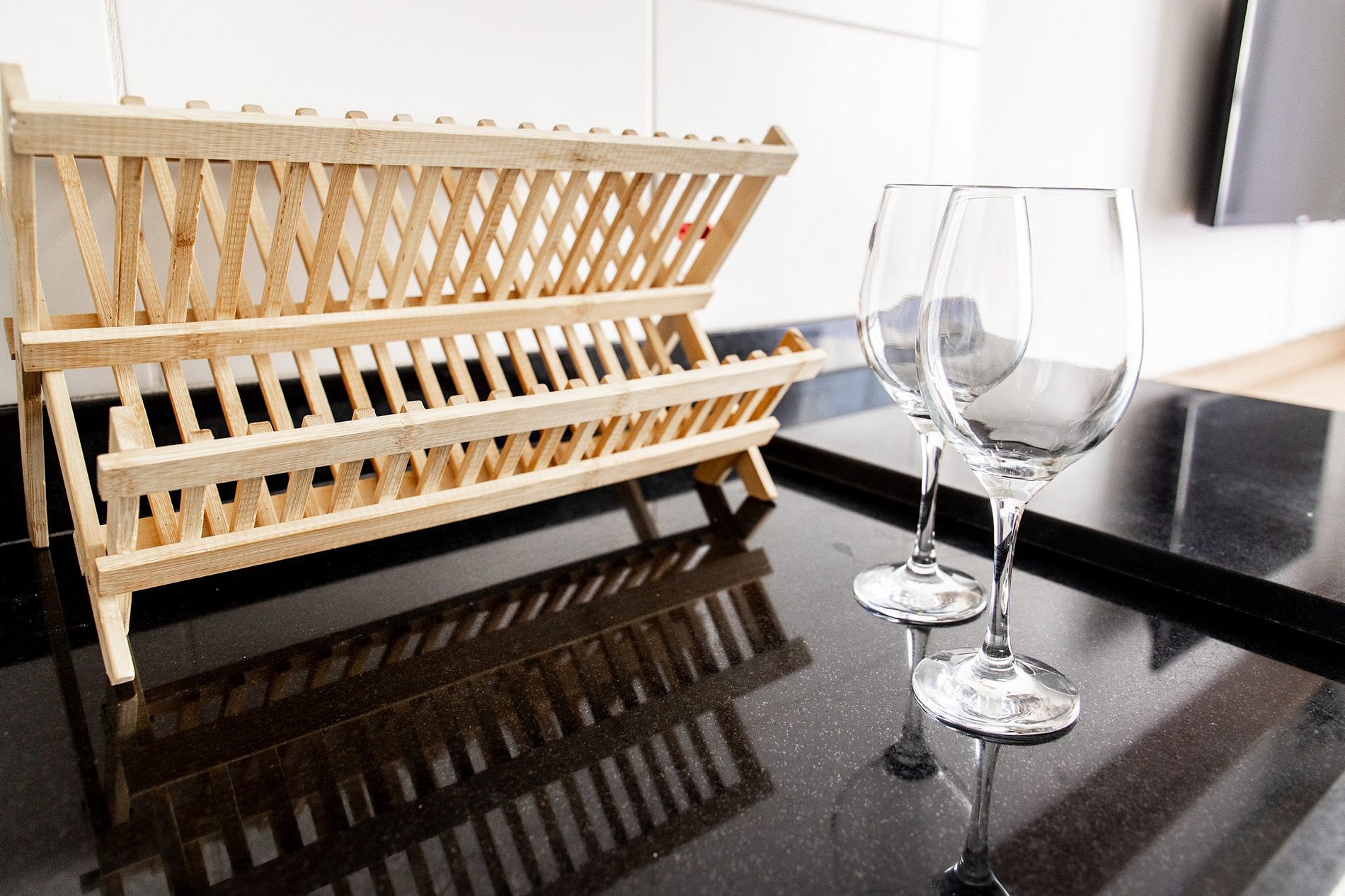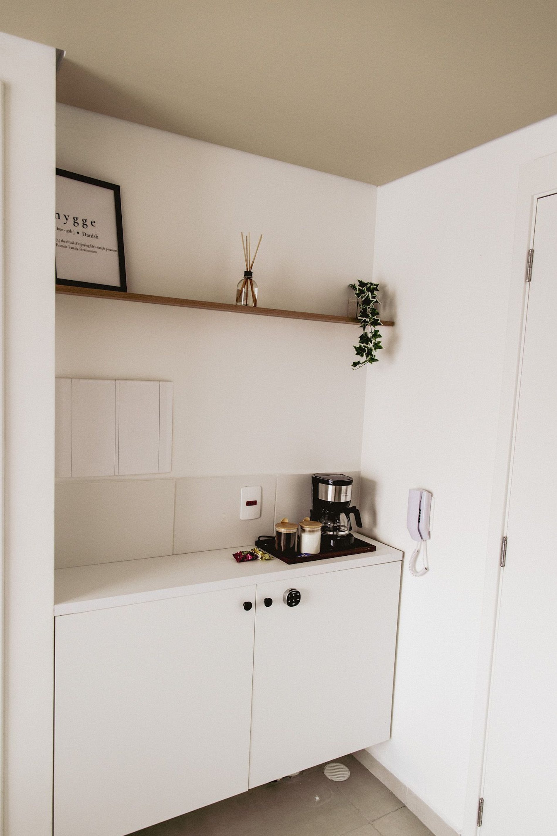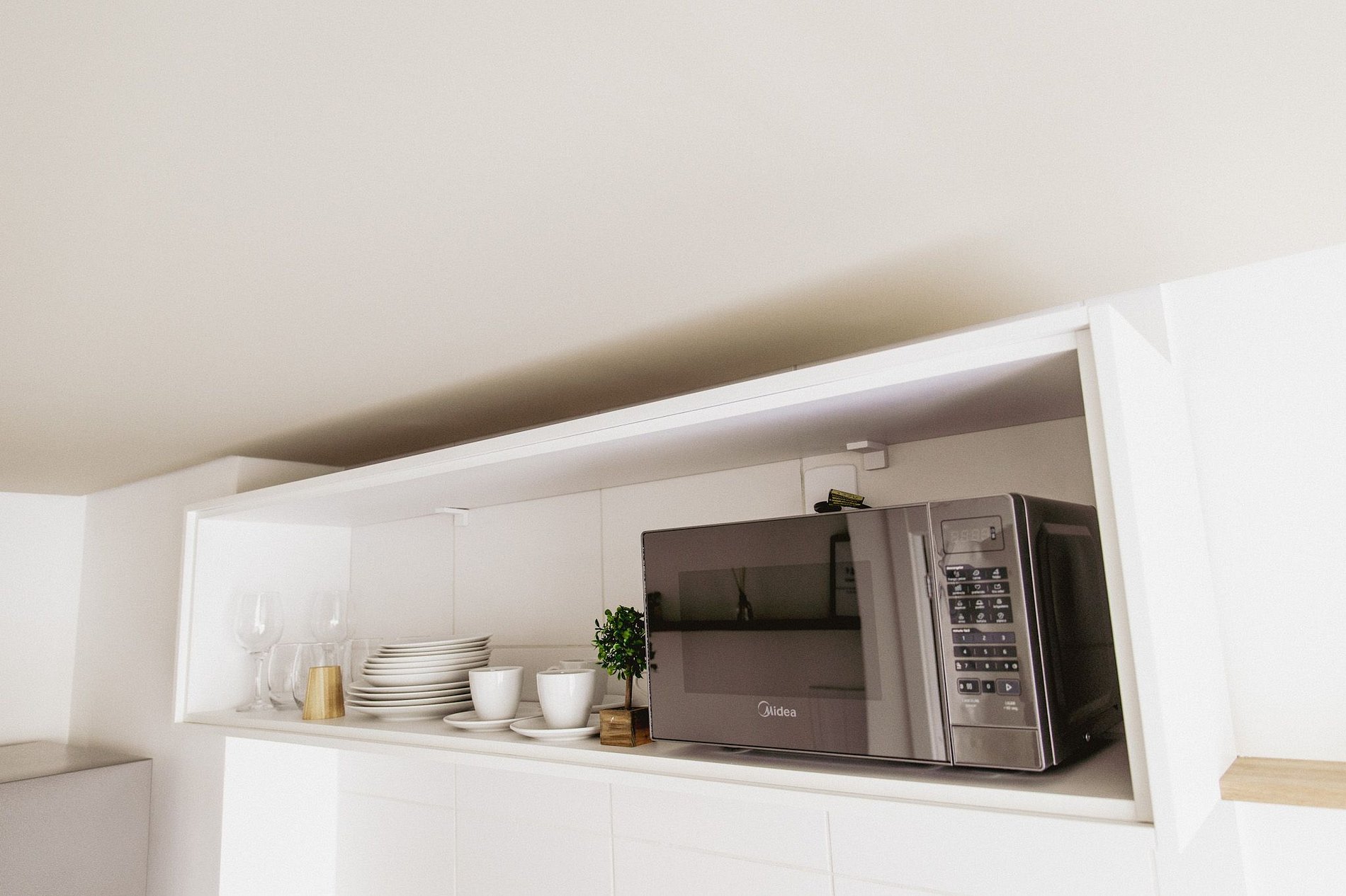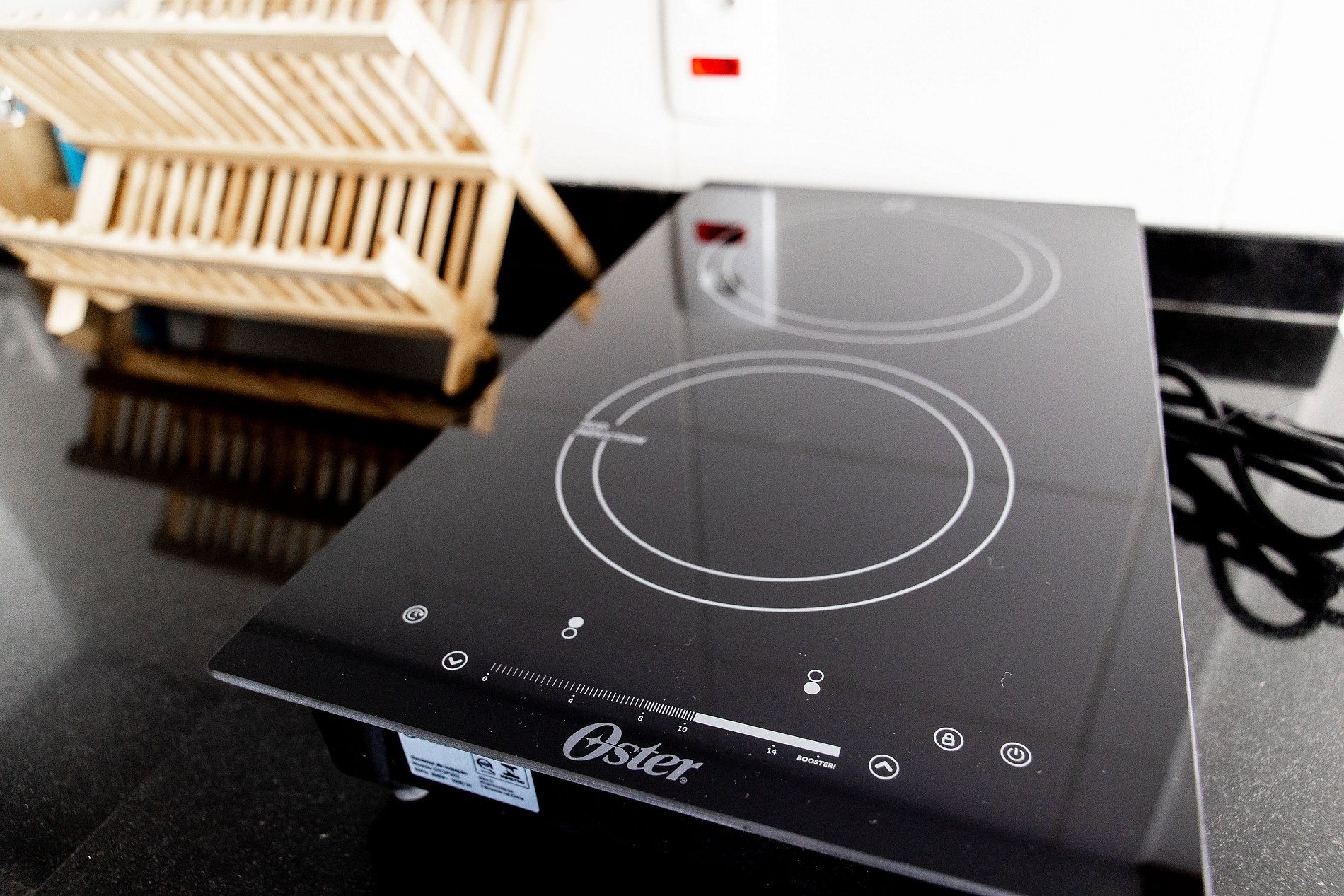 - Cozinha compacta com utensílios, cafeteira, liquidificador e micro-ondas