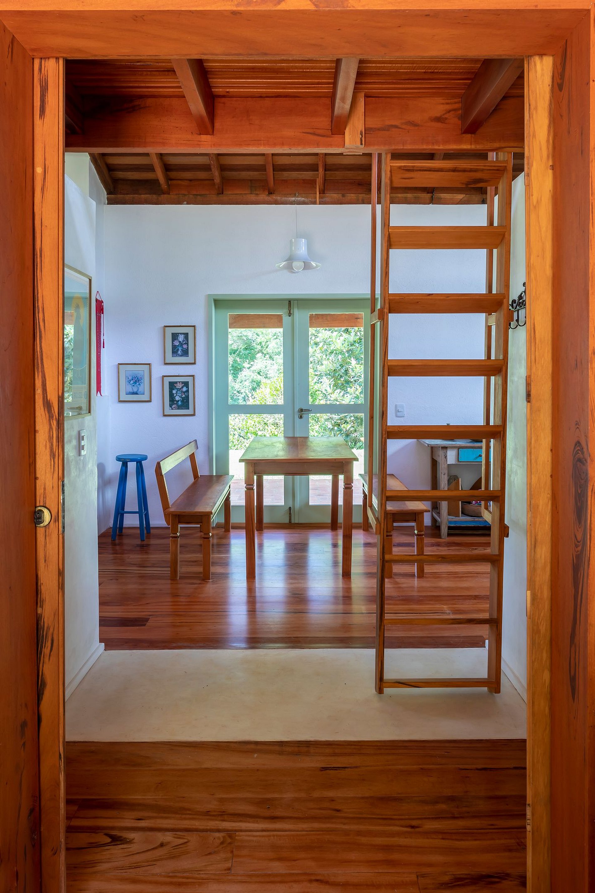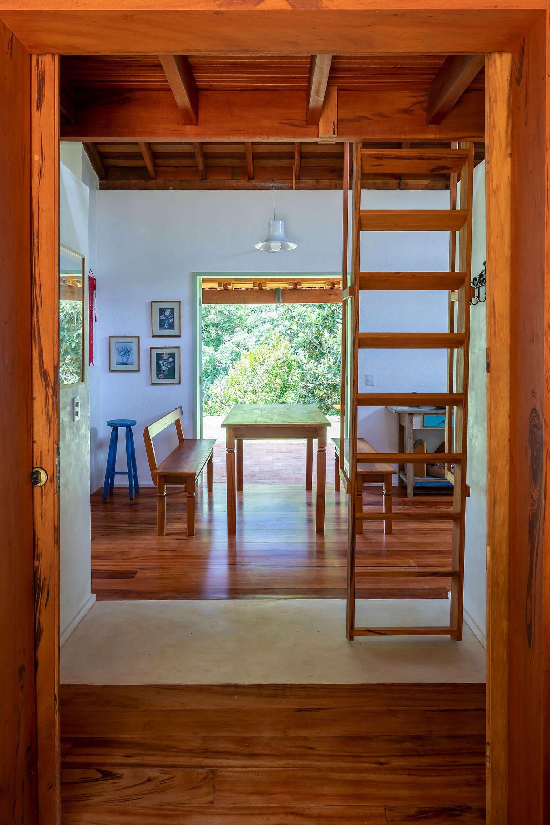 Os 3 quartos, sendo uma suíte e dois quartos atendidos por um banheiro social oferecem camas queen-size confortáveis, enxoval de qualidade e janelas amplas que dão acesso a um pátio, com chuveiro e uma mesa ampla de madeira e bancos, permitindo uma imersão completa no cenário natural ao redor. O banheiro social segue a mesma proposta de estilo e bem-estar, com bancada de mármore, cuba moderna e espelho vintage, além de iluminação natural que valoriza o espaço. O banheiro da suíte, além de tudo isso, também conta com uma banheira para momentos de relaxamento.