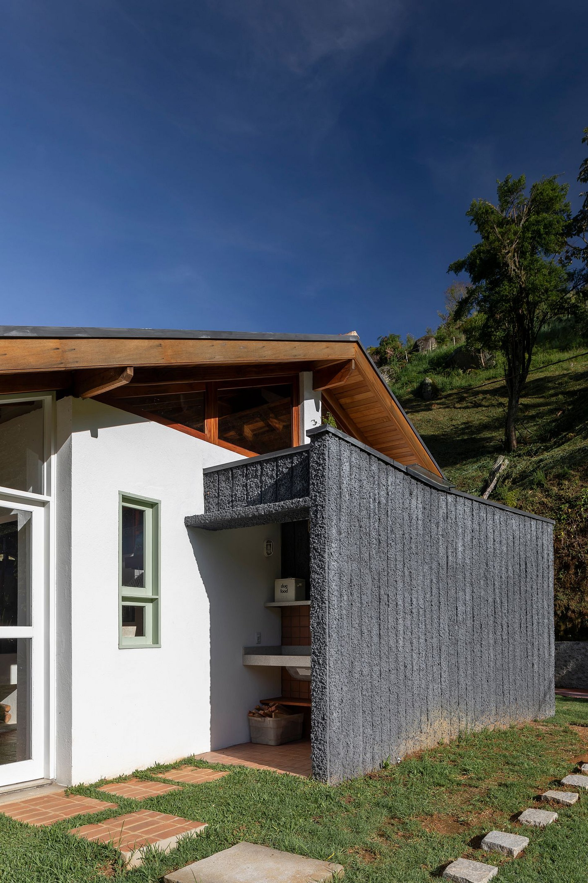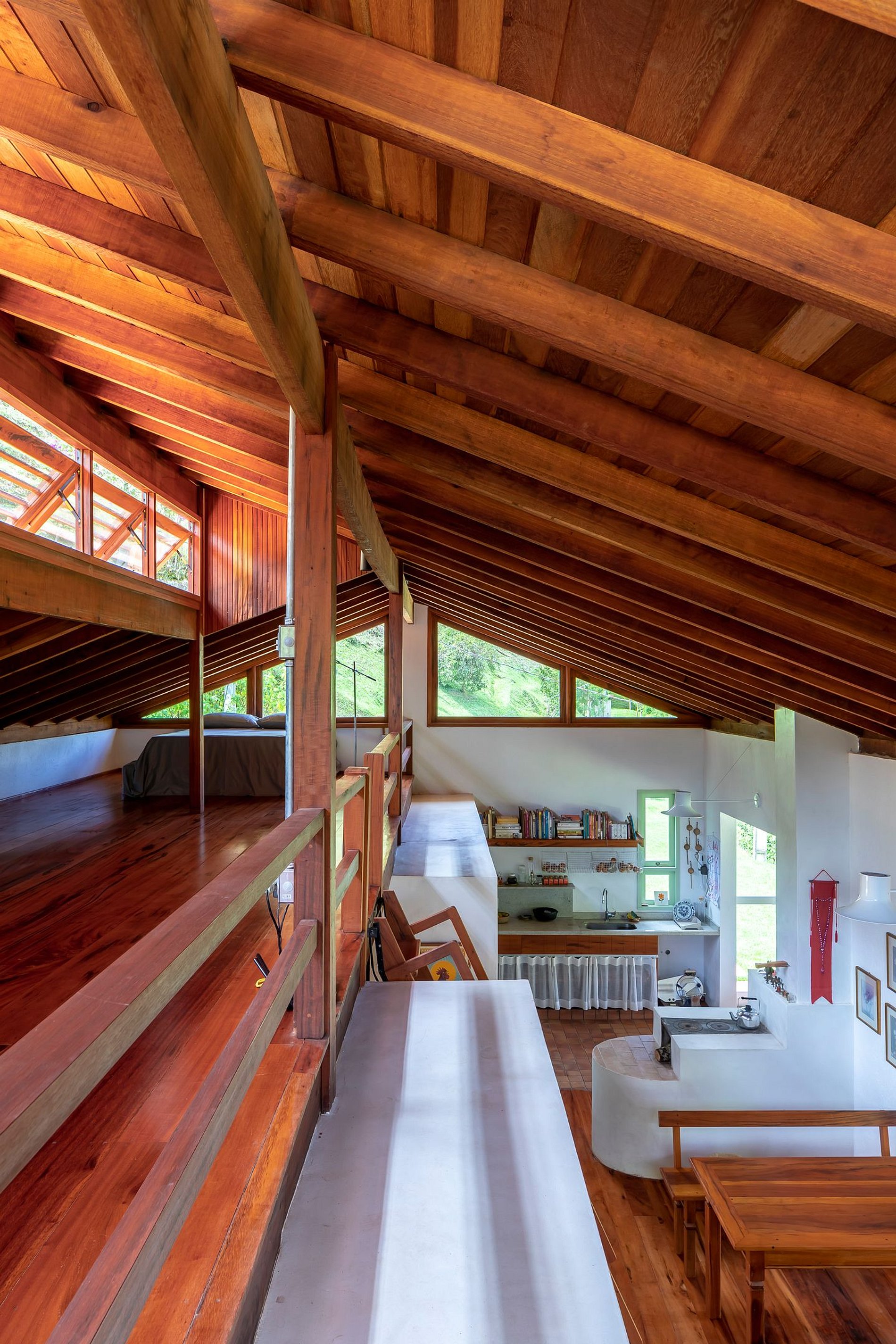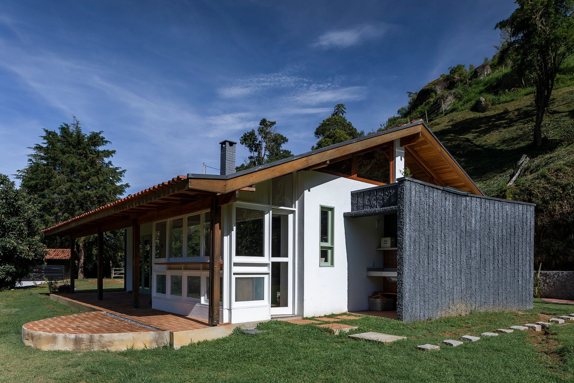 A casa foi projetada para oferecer aconchego e contato com a natureza, sem abrir mão do conforto. Logo na entrada, a cozinha integrada chama a atenção com seu charme rústico: bancada de pedra com vista para o verde e pia com água quente, fogão a lenha, cooktop a gás e todos os utensílios necessários para preparar refeições especiais.
