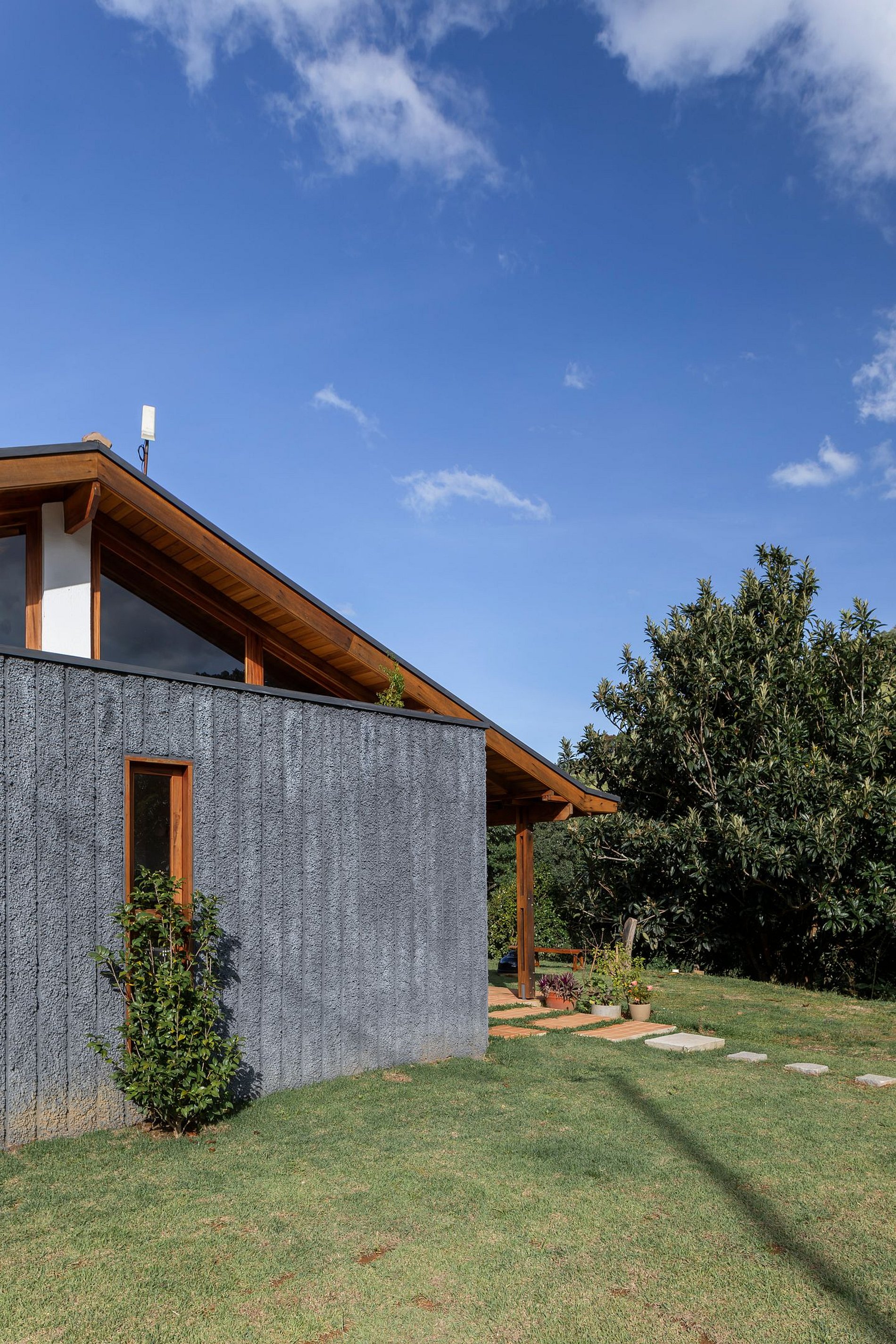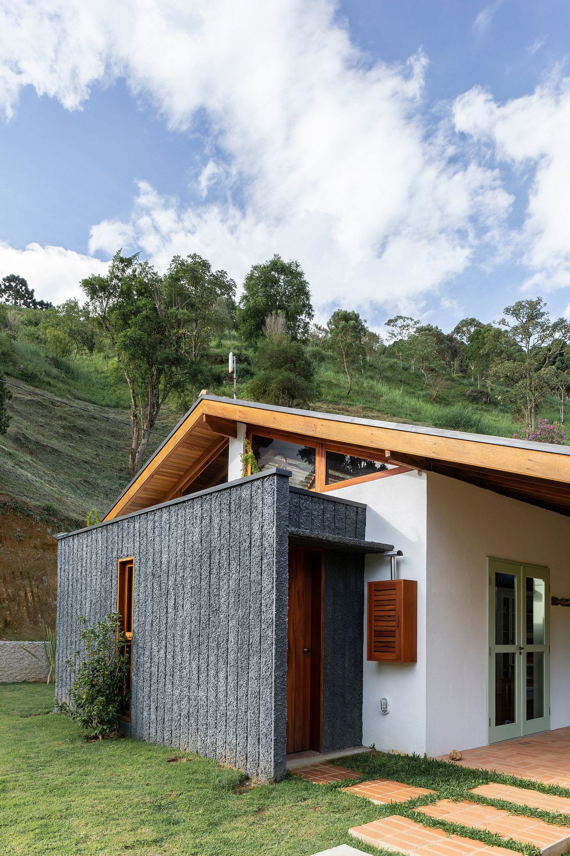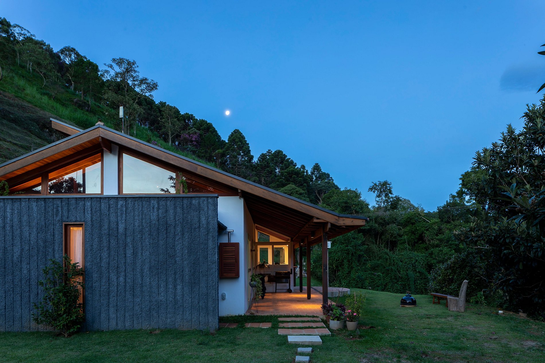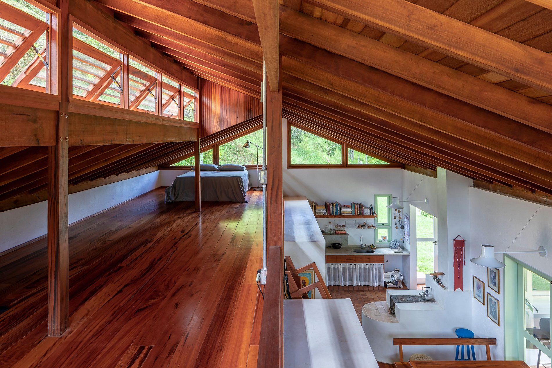 A casa foi projetada para oferecer aconchego e contato com a natureza, sem abrir mão do conforto. Logo na entrada, a cozinha integrada chama a atenção com seu charme rústico: bancada de pedra com vista para o verde e pia com água quente, fogão a lenha, cooktop a gás e todos os utensílios necessários para preparar refeições especiais.