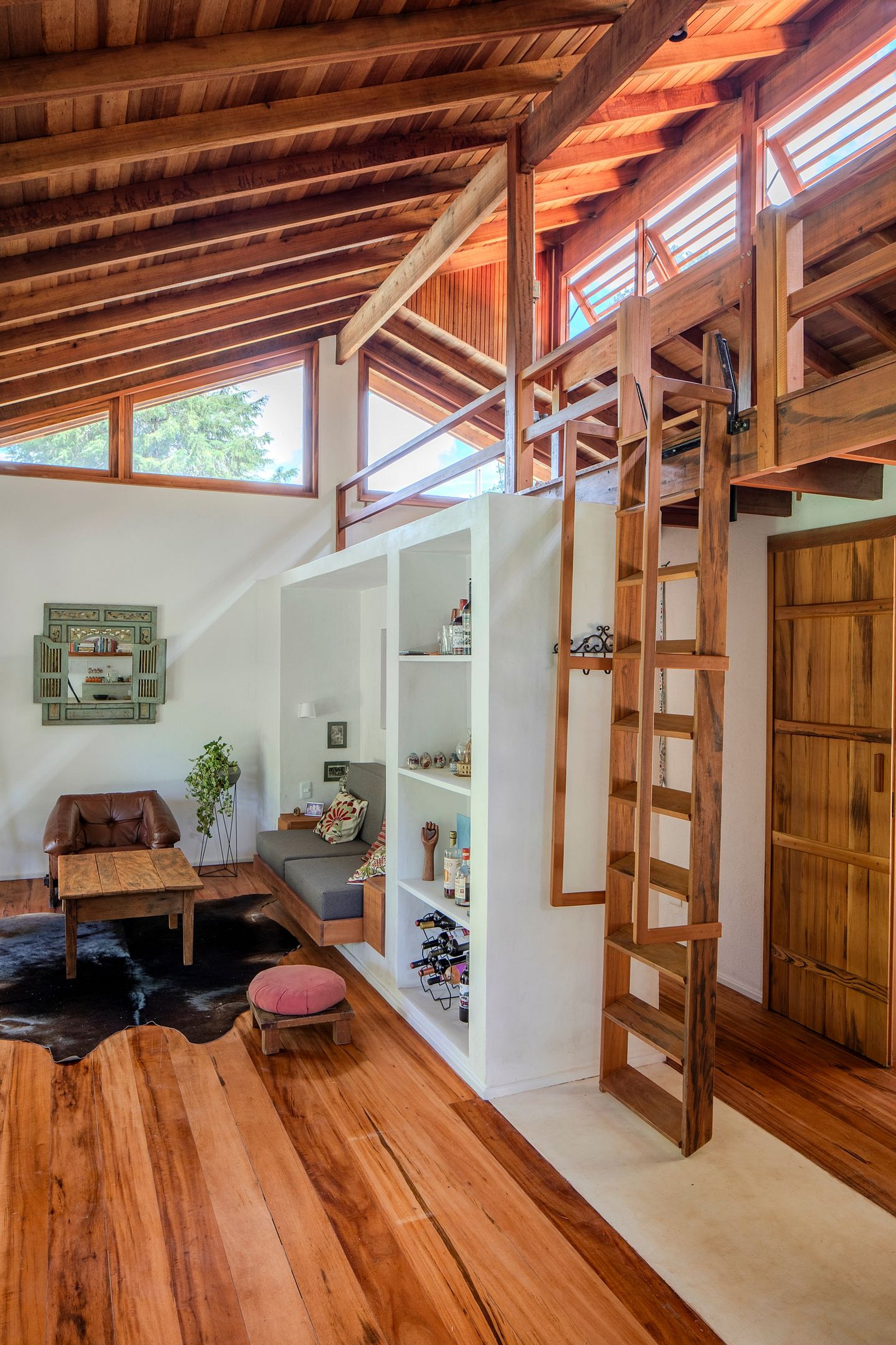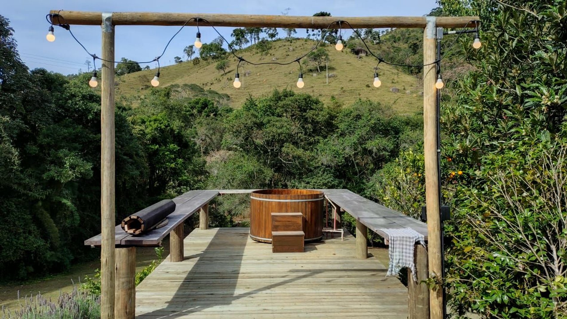 No mezanino de madeira, acessado por uma escada charmosa, há um ambiente extra que pode ser usado para leitura ou descanso, pois conta com duas camas de casal (não possui cortinas). Do lado de fora, o deck com ofurô e assentos para apreciar a paisagem, jardim bem cuidado, horta e pomar, a escadaria de pedra e a varanda com vista para as montanhas criam um clima único de tranquilidade e privacidade. Cada detalhe foi pensado para que a estadia seja memorável, unindo rusticidade e sofisticação em perfeita harmonia.